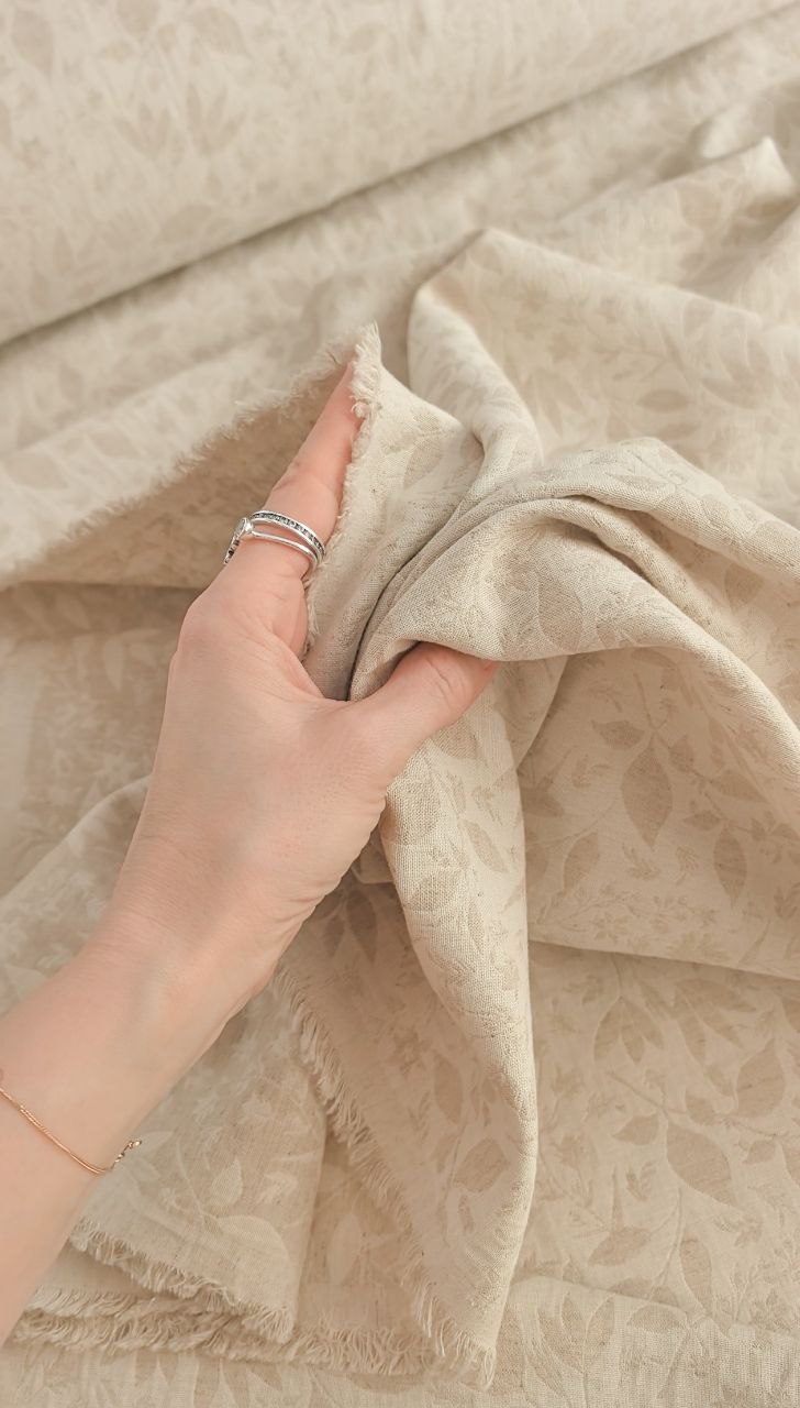 Хлопок со льном с жаккардовым плетением. Ткань двусторонняя. Плетение ровное, ткань немного мнется, немного тянется за счет переплетения нитей, не просвечивает. Подойдет для пошива жакетов, рубашек, платьев, юбок, сарафанов. Усадка 3%.