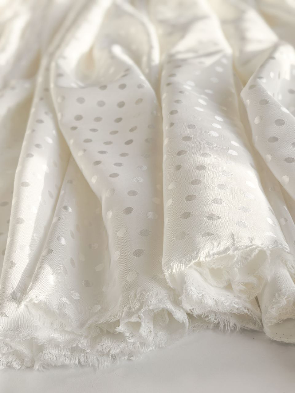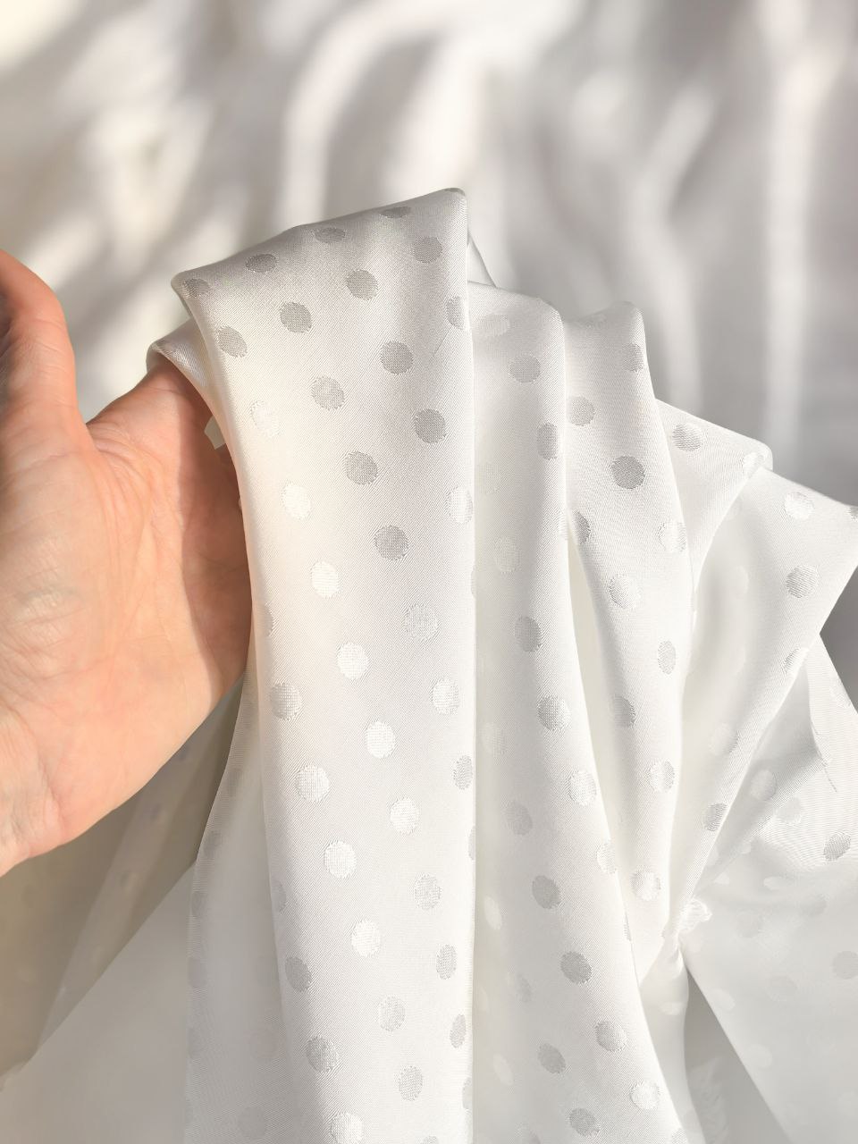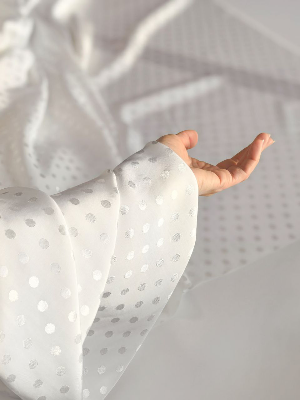Материал имеет деликатный жаккардовый рисунок в виде мелкого горошка диаметром 8 мм, который мягко блестит при свете и делает ткань по-настоящему нарядной.