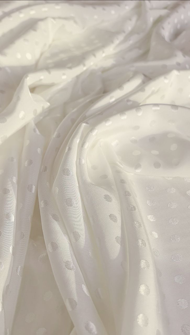 Изысканный жаккардовый узор с мелким блестящим горошком создаёт мягкую игру света и делает ткань невероятно женственной и благородной.