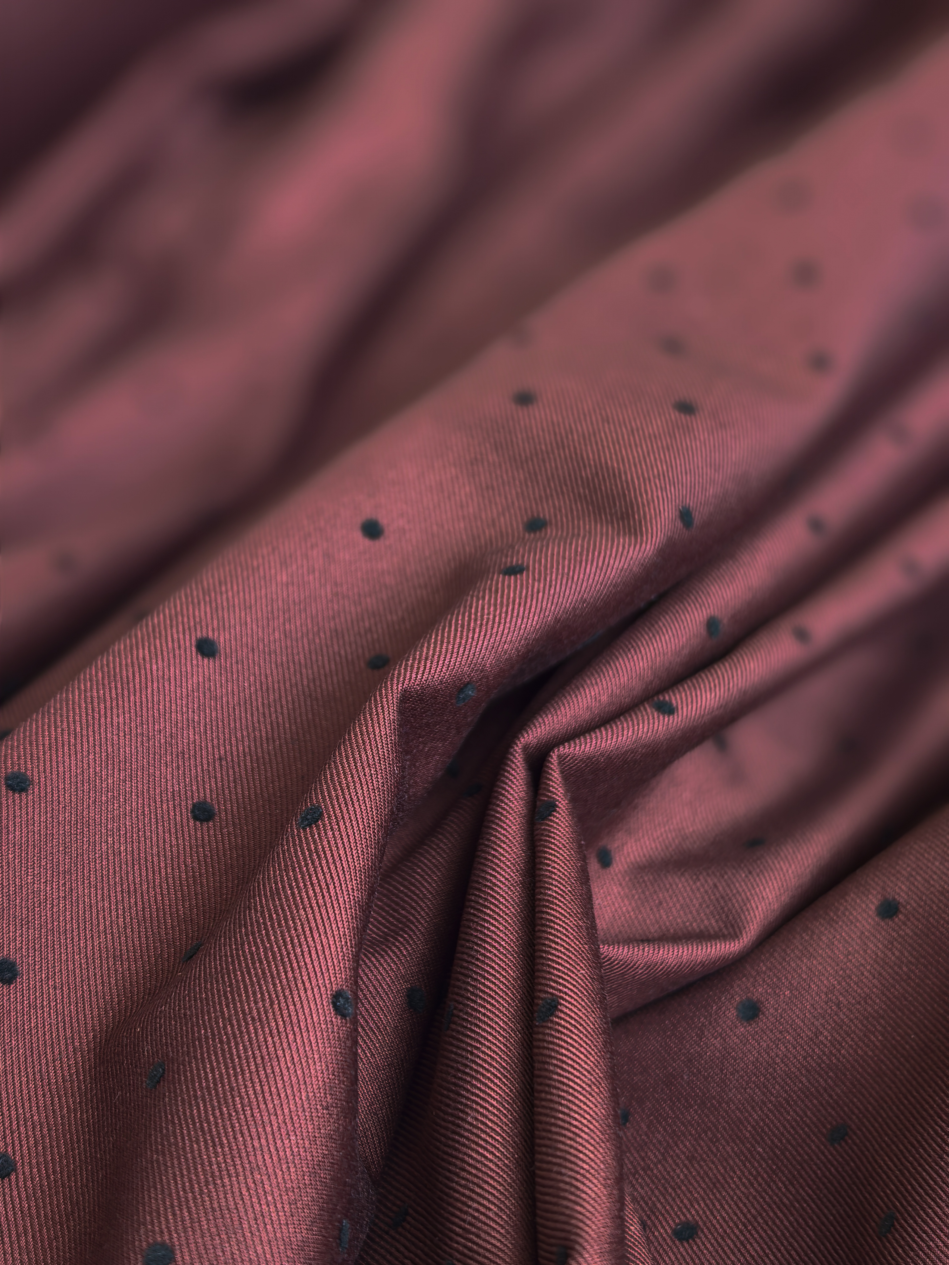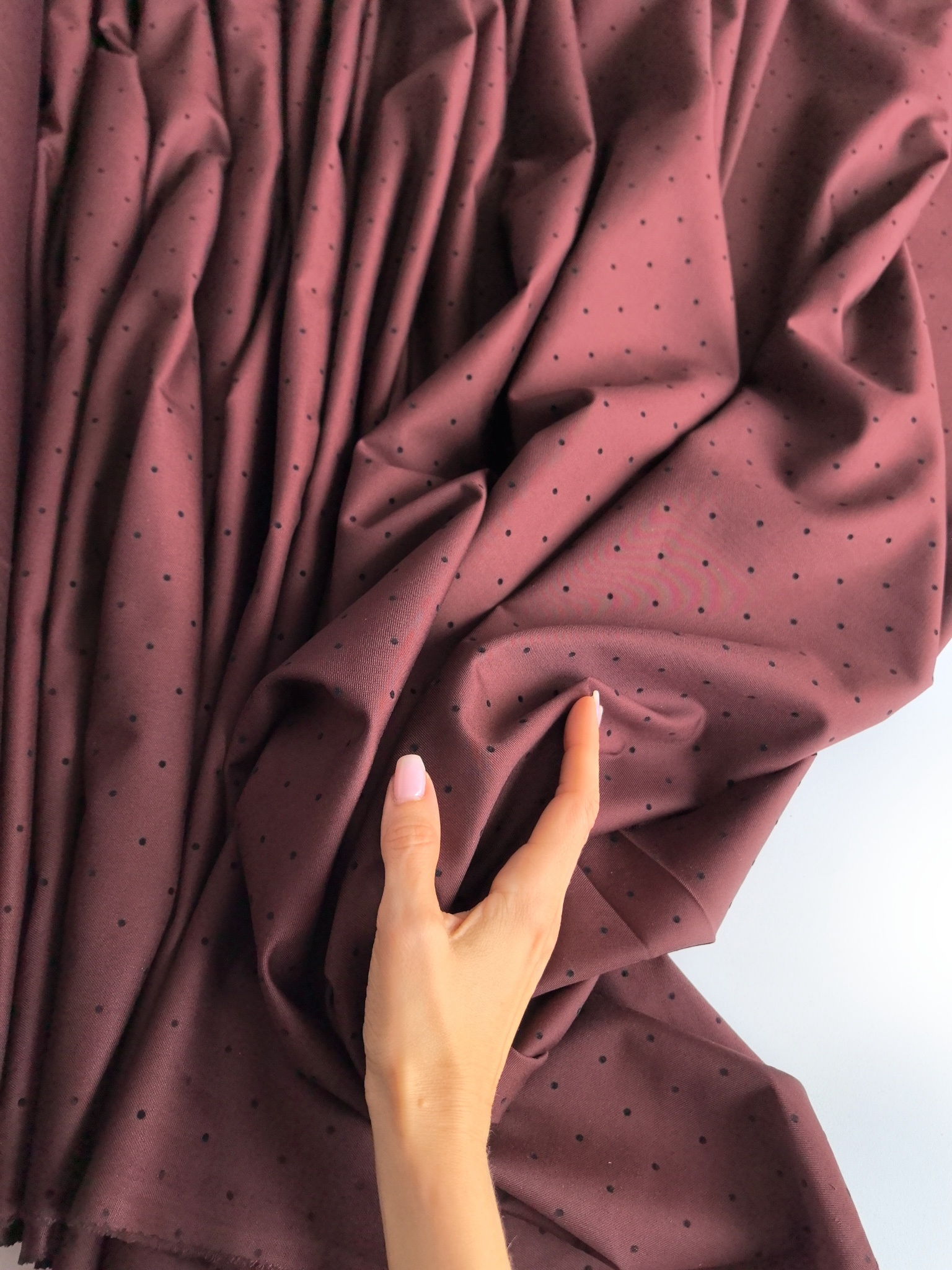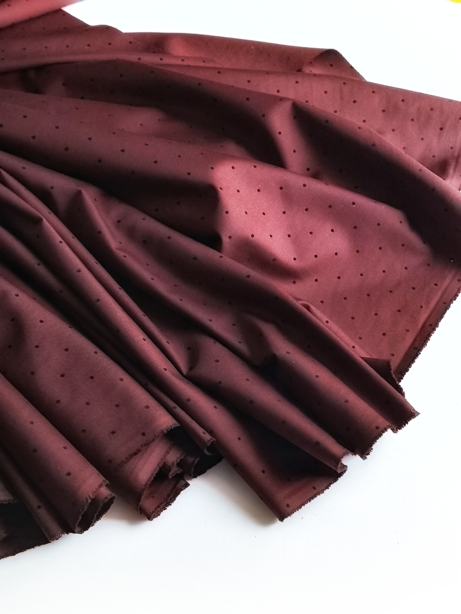 Элегантная костюмная ткань с бархатным горошком — идеальный выбор для стильных и практичных изделий. Материал приятный на ощупь, пластичный, легко утюжится, практически не сминается. Благодаря бархатному принту в горошек ткань выглядит дорого и благородно.