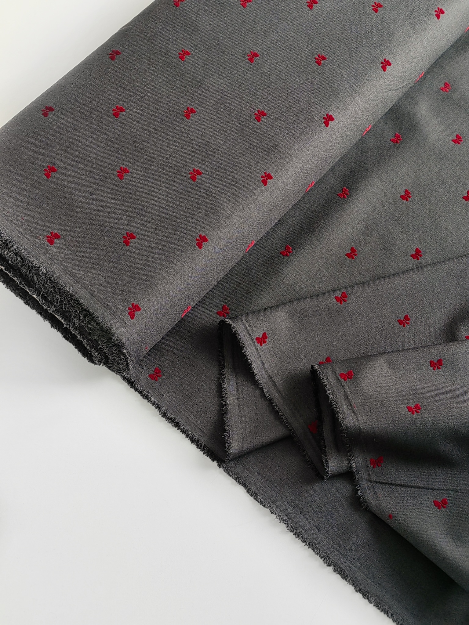 Ищете оригинальную ткань для пошива костюма или жилета? Представляем костюмную ткань с бархатными красными бантиками — стильное решение для создания деловой, повседневной или нарядной одежды.