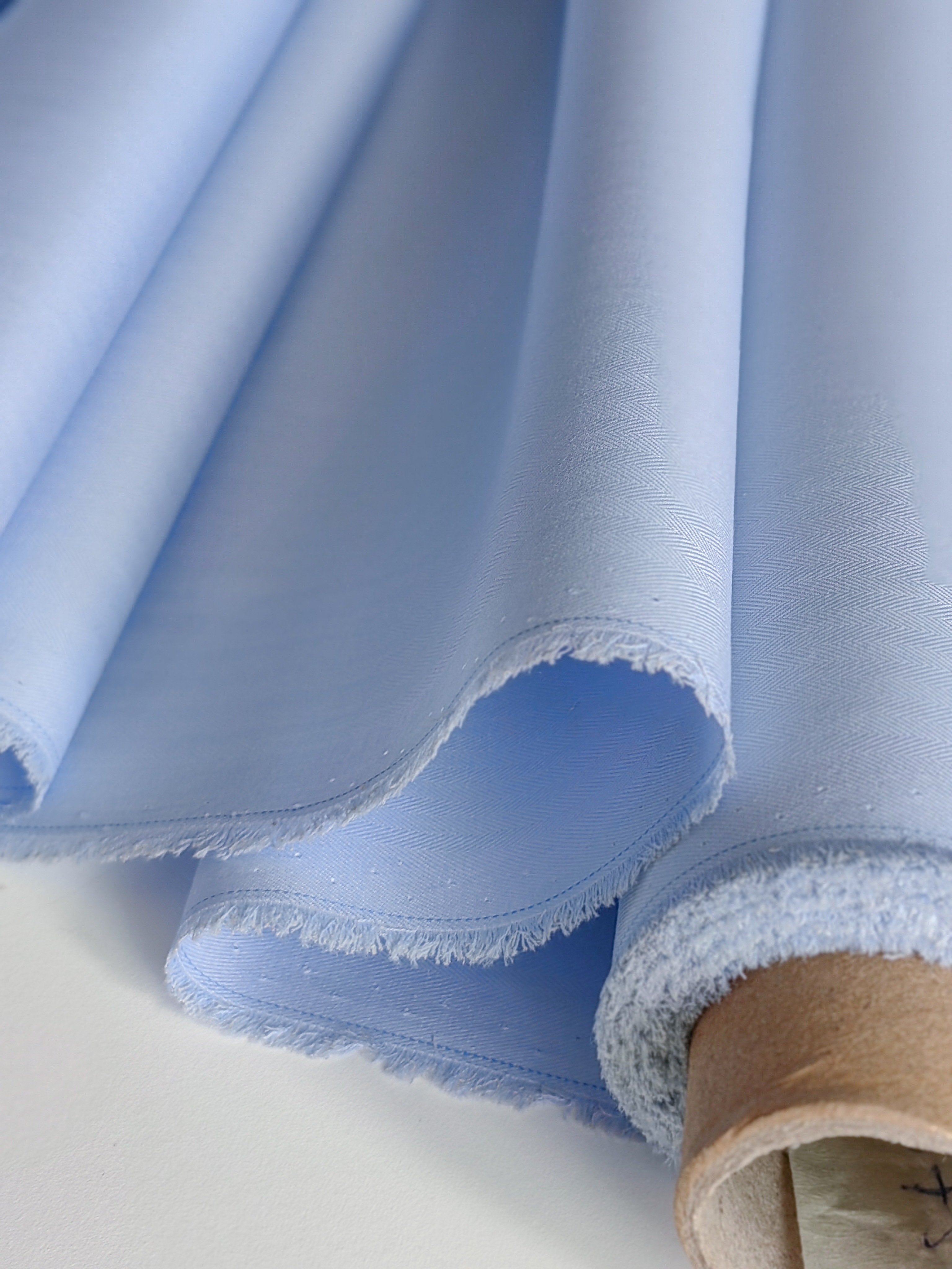 Рубашечная ткань на основе хлопка в фактурную полоску "елочка" (можно увидеть, если присмотреться). Не тянется, подвержена сминанию.