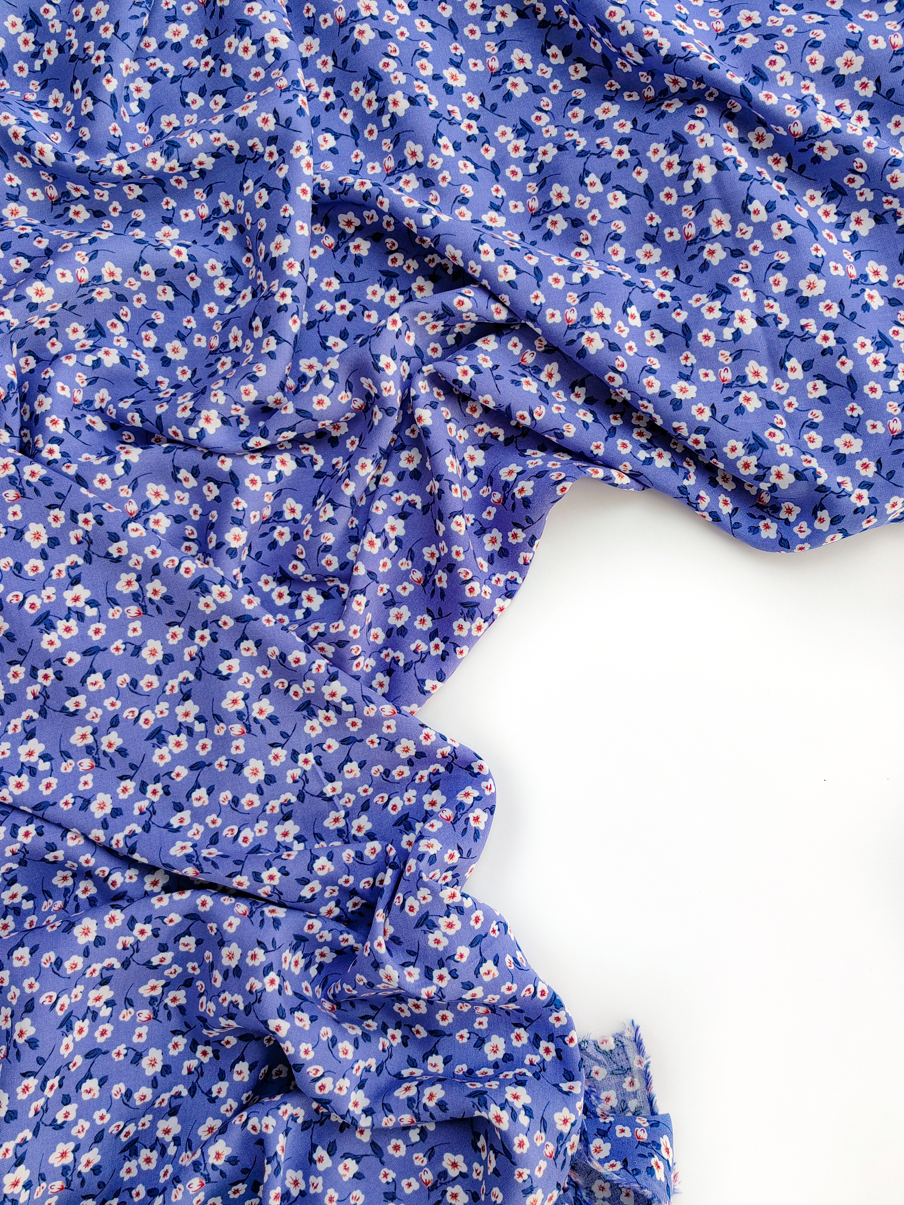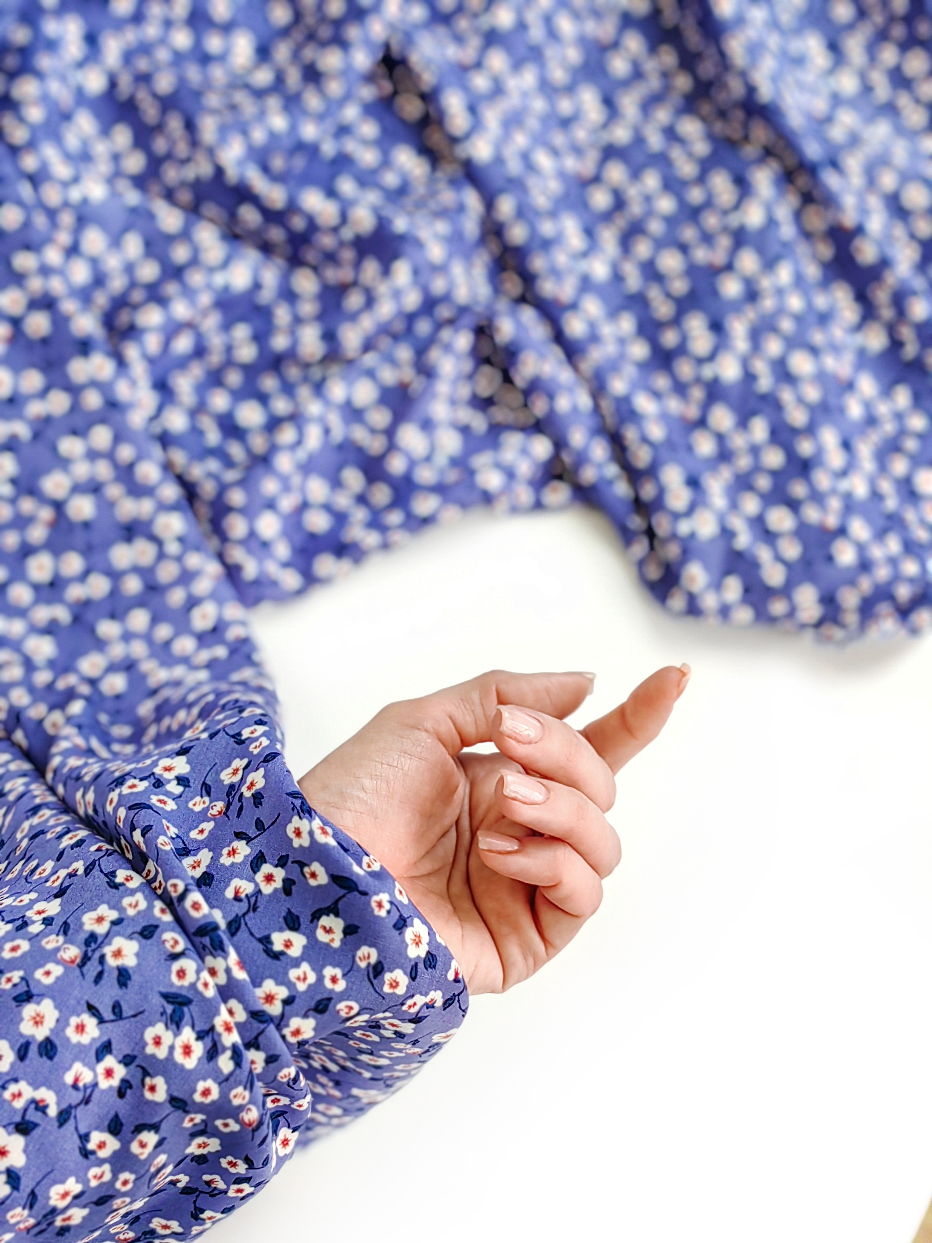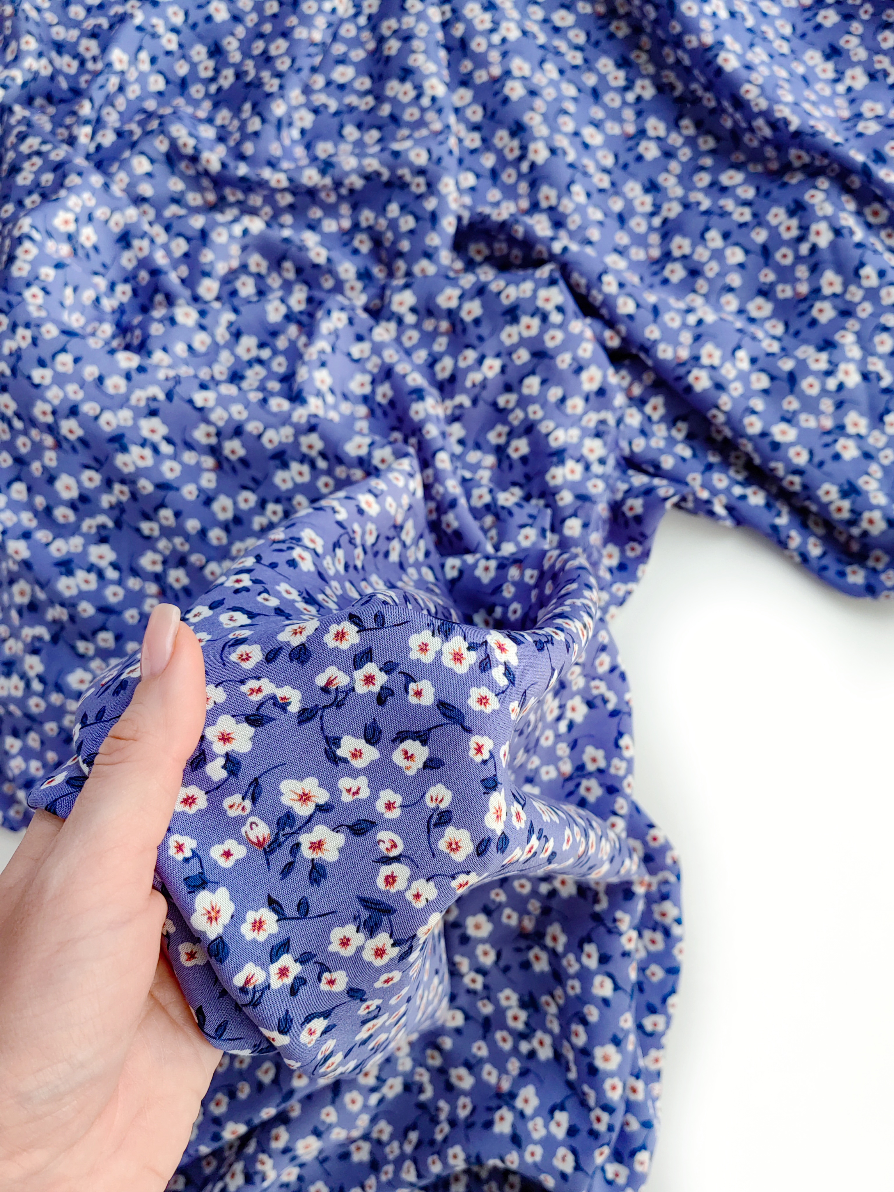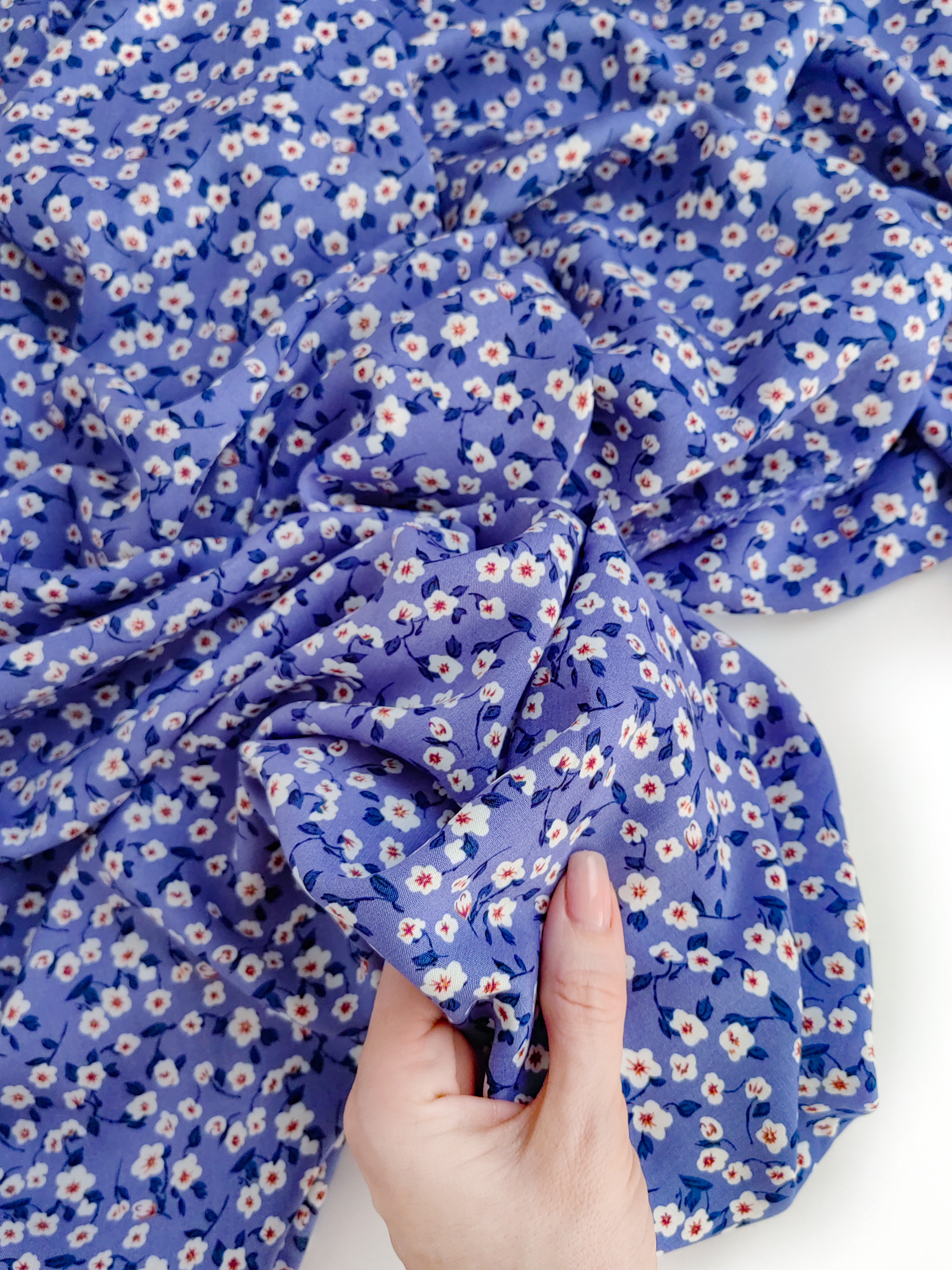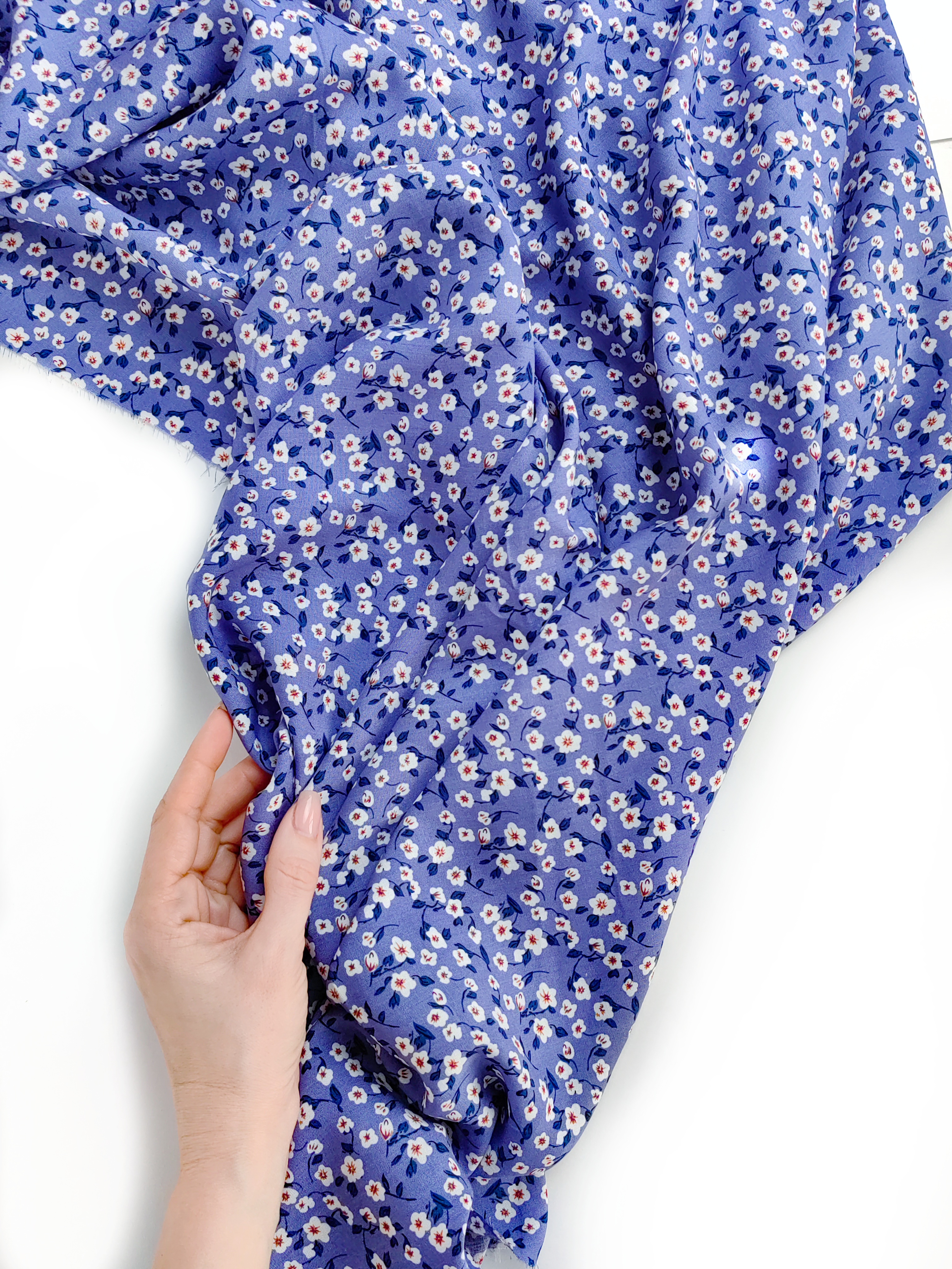 Летящая, струящаяся ткань, нежная и шелковистая на ощупь. Воздушная и красиво драпируется. Идеальна для пошива платьев, блуз, юбочек, широких брюк, рубашек, топов. Немного мнется, но благодаря цветочкам заломы малозаметны.