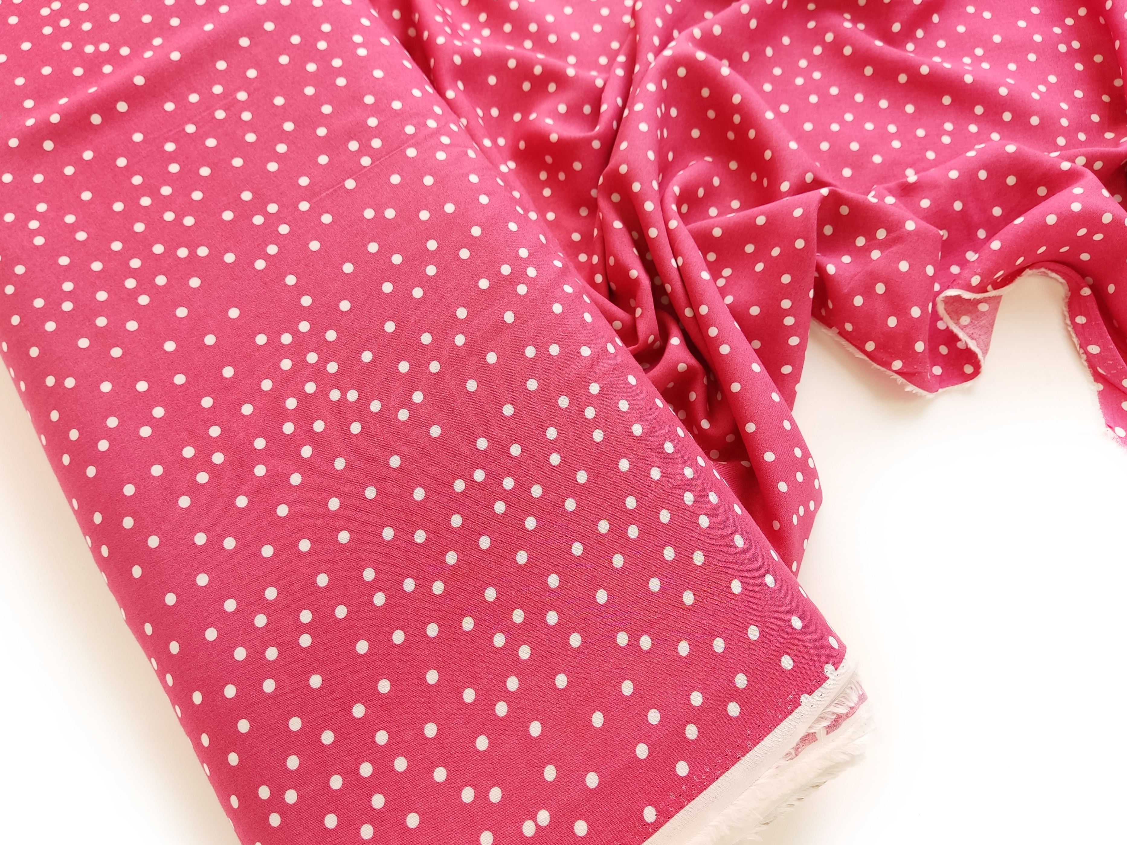 Летящая, струящаяся ткань, нежная и приятная на ощупь. Воздушная и красиво драпируется. Цвет ткани - розовый. Кокетливый Горошек расположен хаотично. Идеально для пошива платьев, блуз, юбочек.