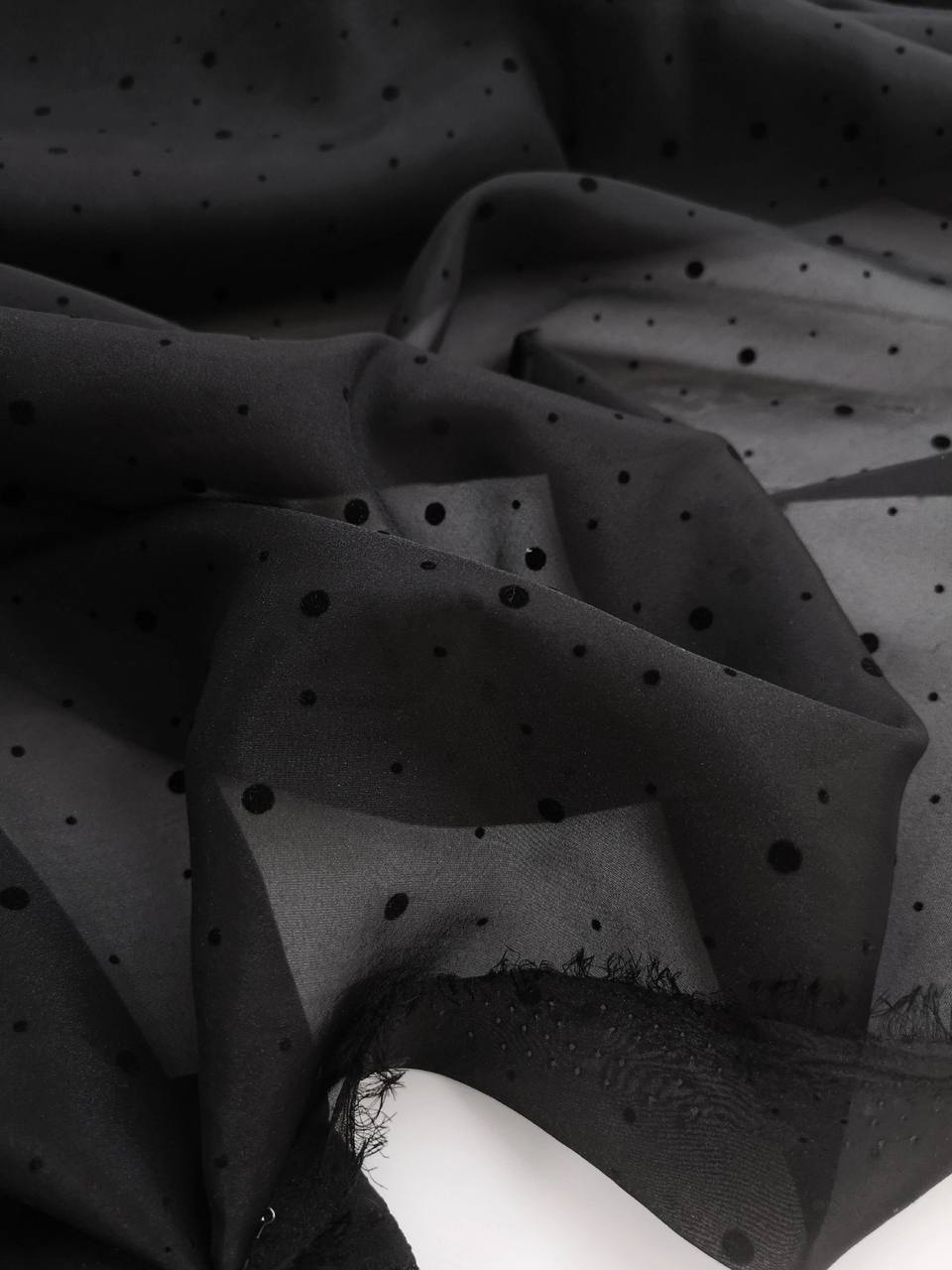 Невесомая органза в кокетливый бархатный горошек. Имеет деликатный блеск, цвет черный.
