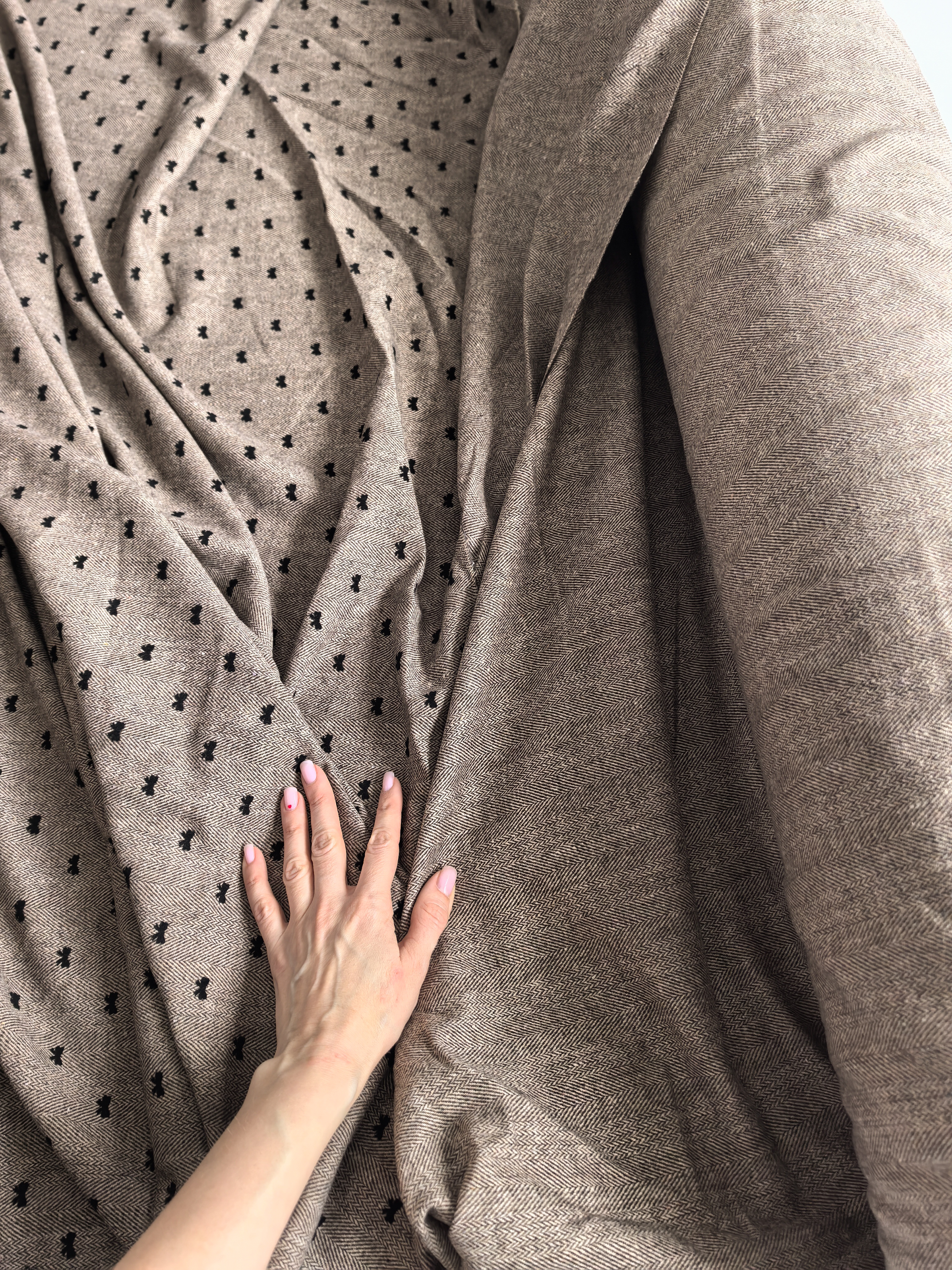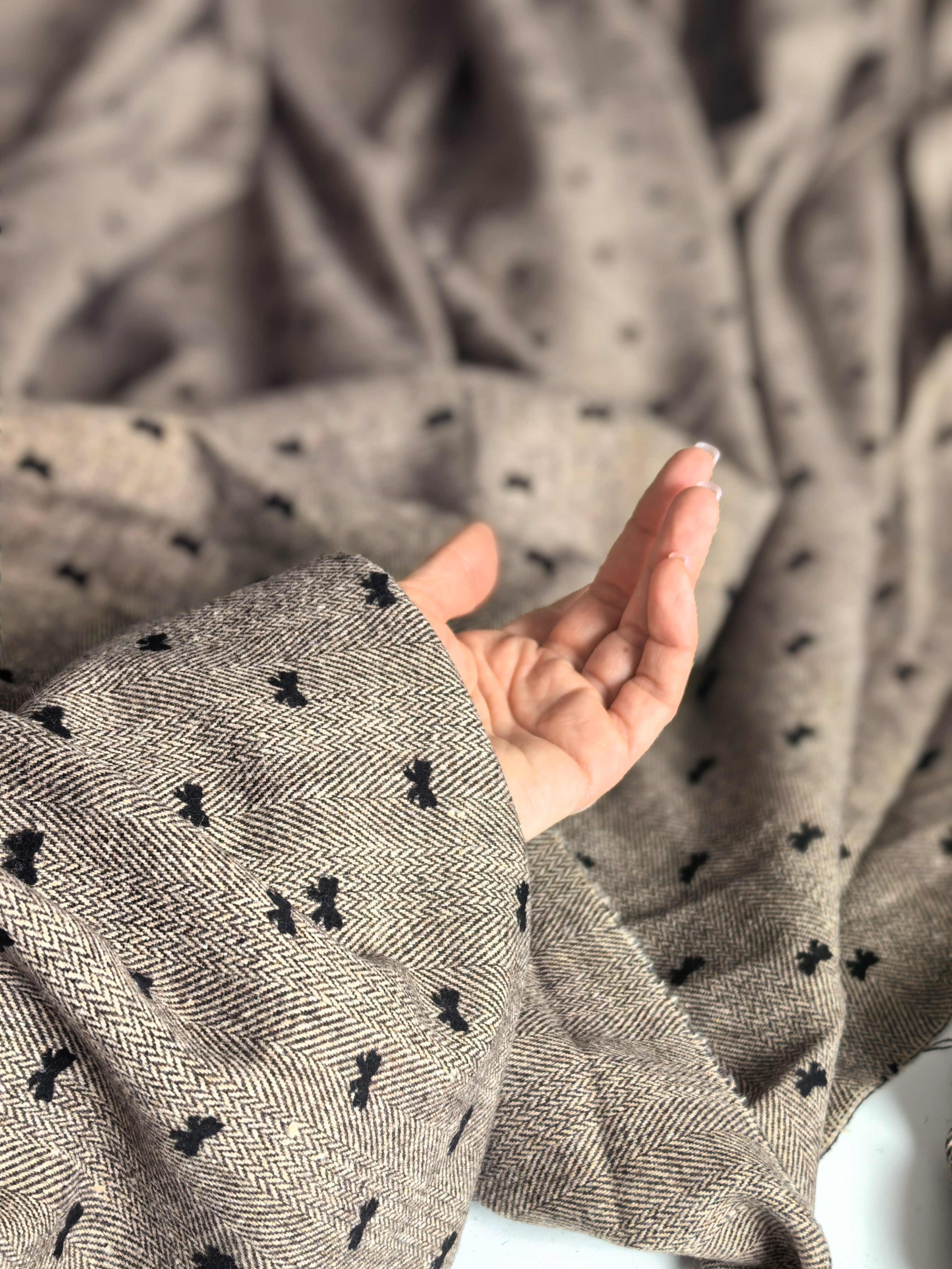 Откройте для себя очарование классики с ноткой игривости! Костюмная ткань “Ёлочка с бантиками” сочетает изысканный рисунок «ёлочка» и деликатные чёрные бантики, создавая эффектный и современный образ. Материал плотный, но мягкий, приятный к телу, отлично держит форму и не мнётся. Благодаря составу 20% шерсти и 80% полиэстера, ткань сочетает тепло натурального волокна и практичность синтетических волокон — идеально для демисезонных и зимних образов. Подходит для пошива:  • классических и женственных костюмов  • жакетов, брюк, юбок, сарафанов, платьев  • элементов верхней одежды Характеристики:  • Ширина: 148 см  • Плотность: 400 г/м²  • Состав: 20% шерсть, 80% полиэстер  • Размер бантиков: 1,2 × 0,8 см  • Узор: классическая “ёлочка” с миниатюрными бантиками Эта ткань — выбор тех, кто ценит стиль, уют и качество. Создайте эксклюзивный костюм или платье, которое подчеркнёт вашу индивидуальность! Видео смотрите тут и тут Обратите внимание. Цветопередача может отличаться от действительности. Это зависит от модели и экрана вашего устройства, а также вашего цветовосприятия. Магазин Галереятканей.рф не несёт ответственности за несоответствие цвета реального товара и изображения на Вашем устройстве. Мы рады предоставить вам дополнительные фото и видео при необходимости.