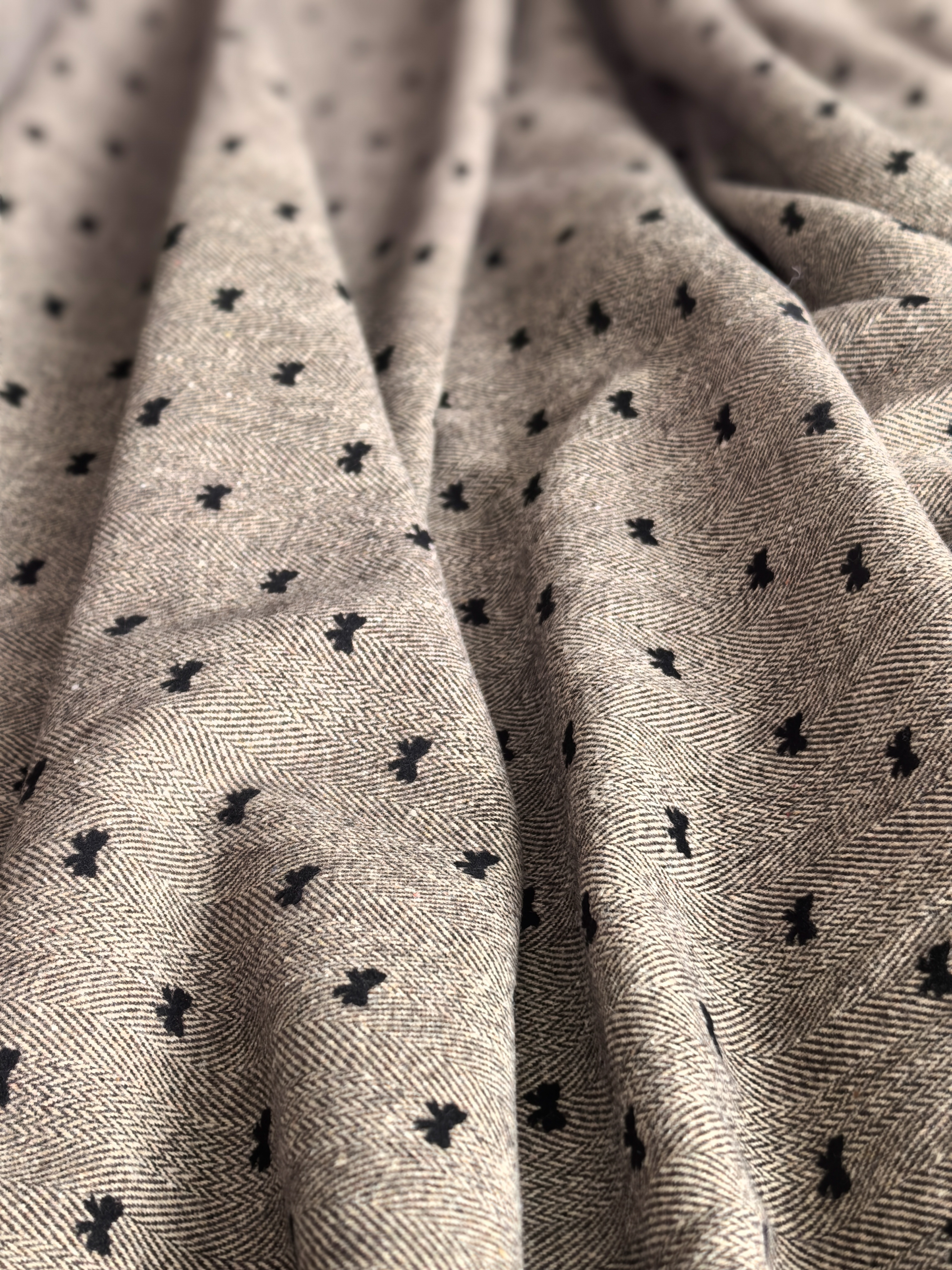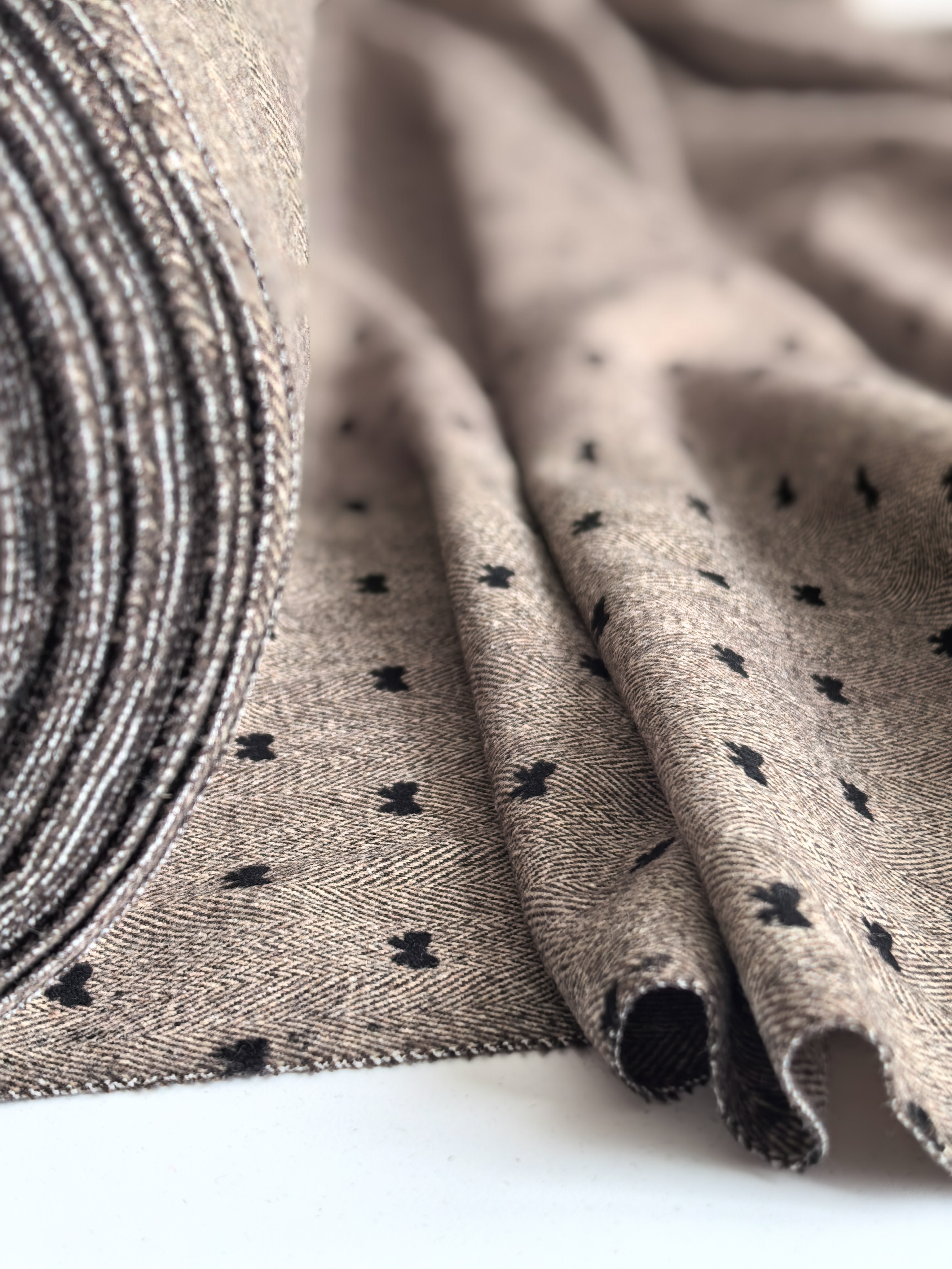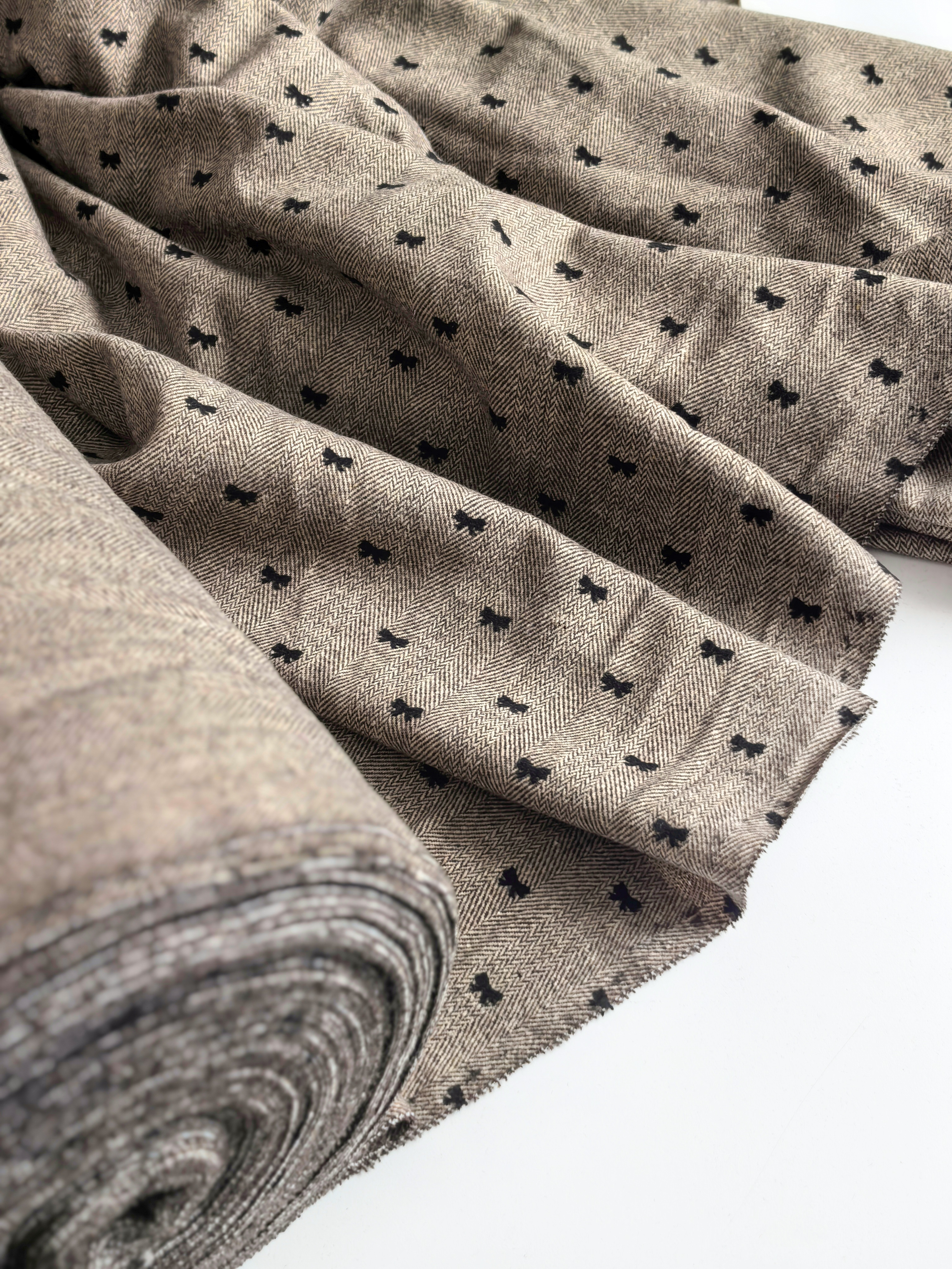 Откройте для себя очарование классики с ноткой игривости! Костюмная ткань “Ёлочка с бантиками” сочетает изысканный рисунок «ёлочка» и деликатные чёрные бантики, создавая эффектный и современный образ.