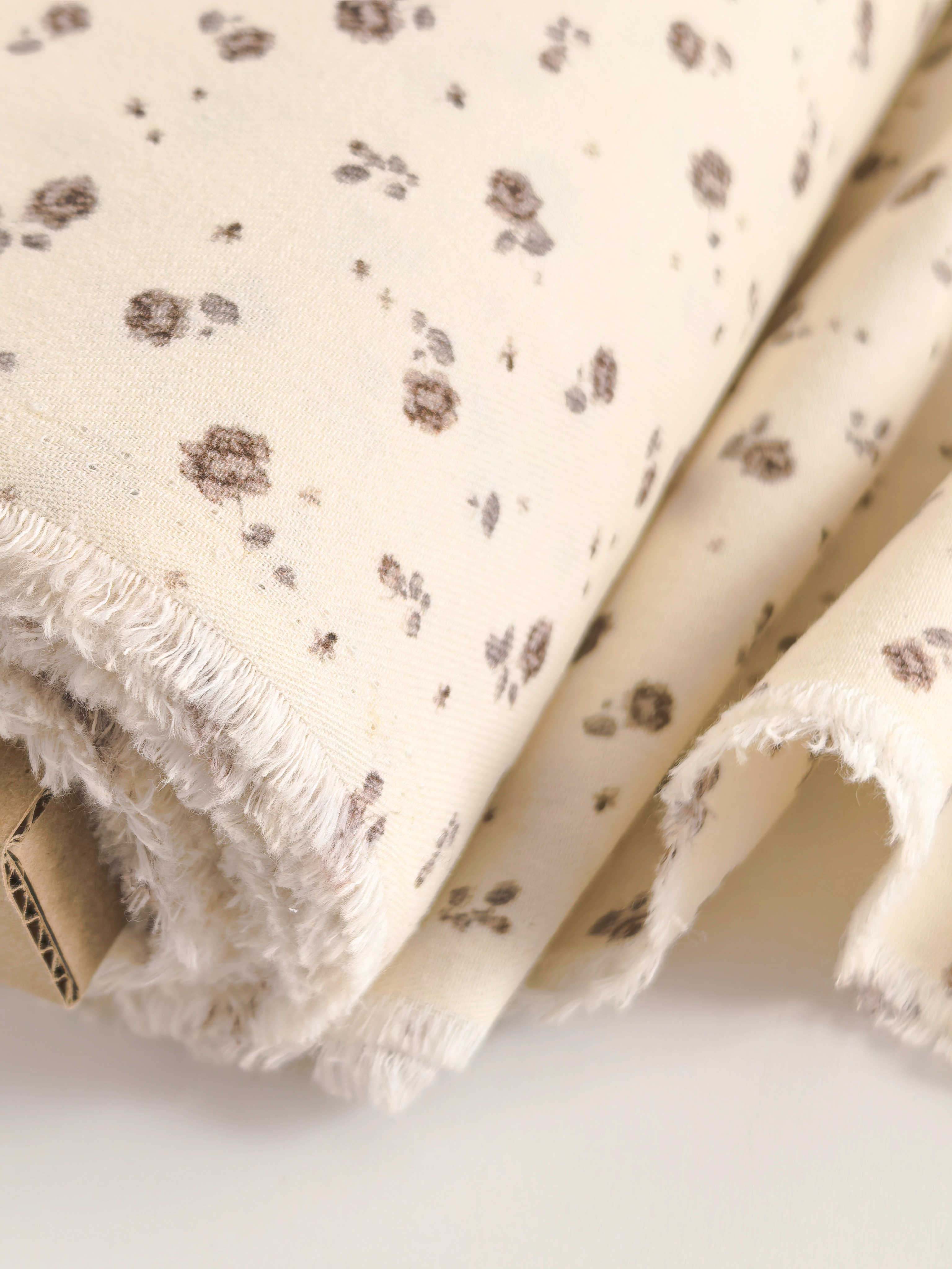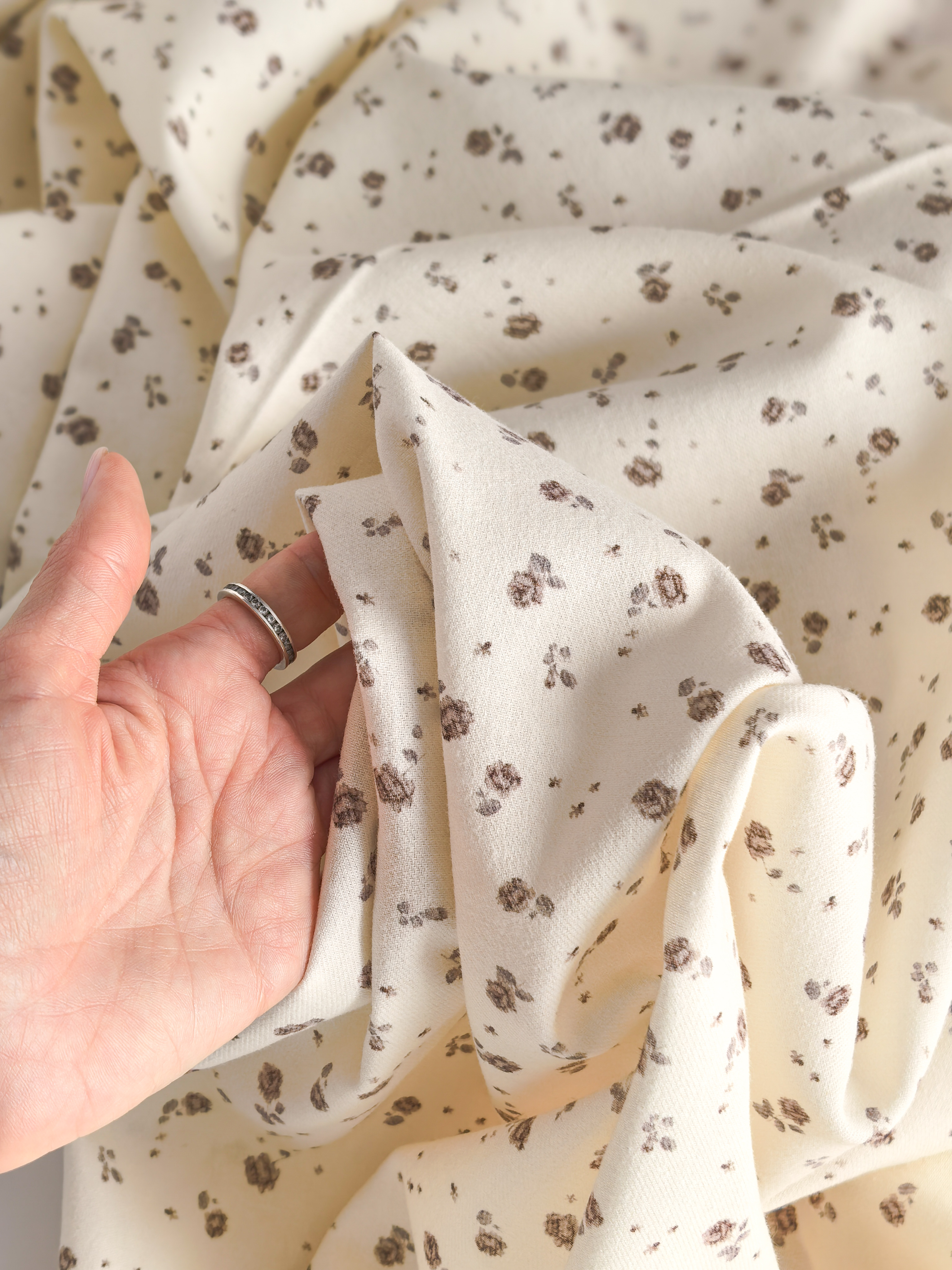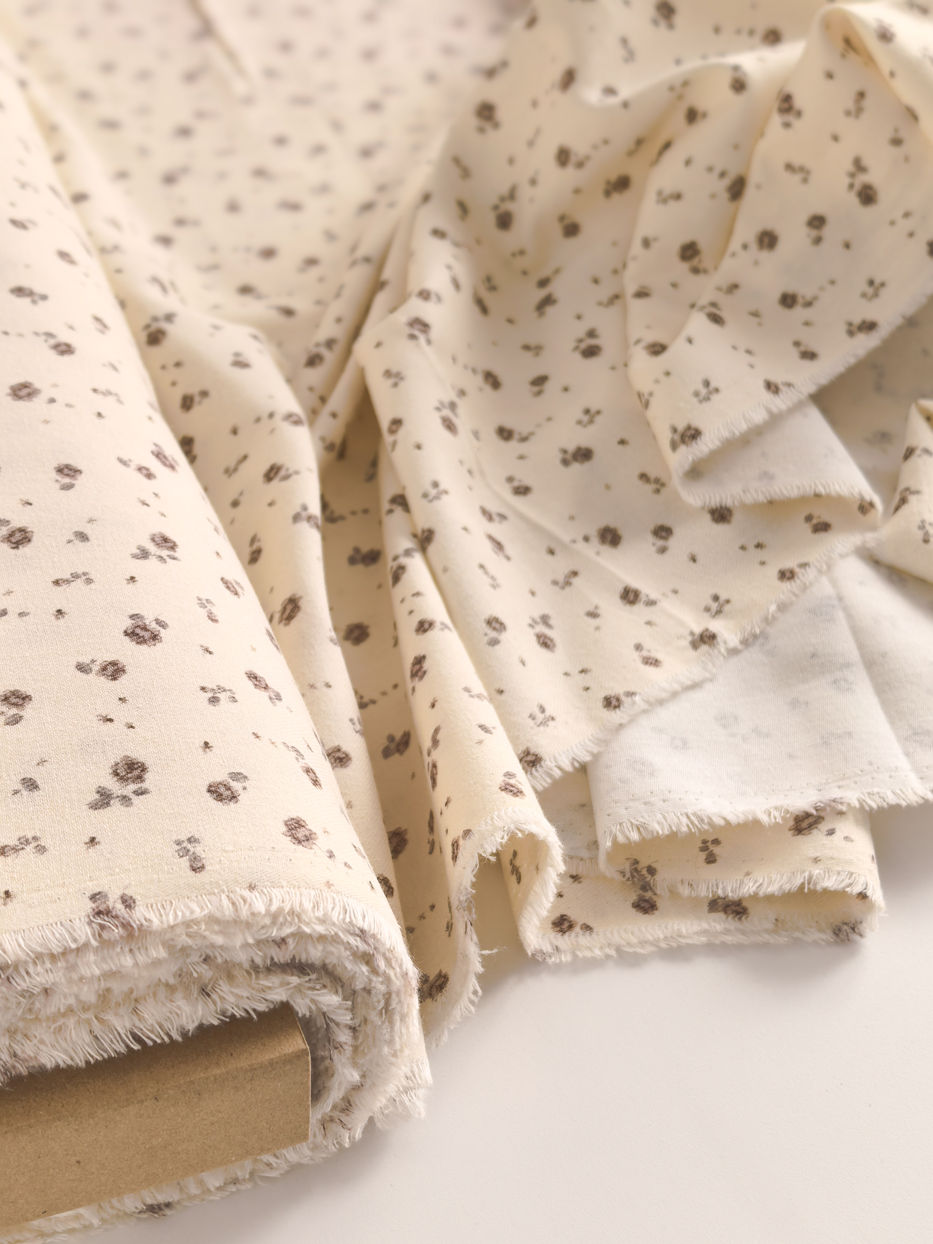 Мелкий цветочный рисунок в шоколадно-коричневых оттенках на светлом фоне выглядит спокойно и универсально — ткань подойдёт как для детских изделий, так и для взрослого гардероба. Материал не тянется, легко кроится и удобен в пошиве.