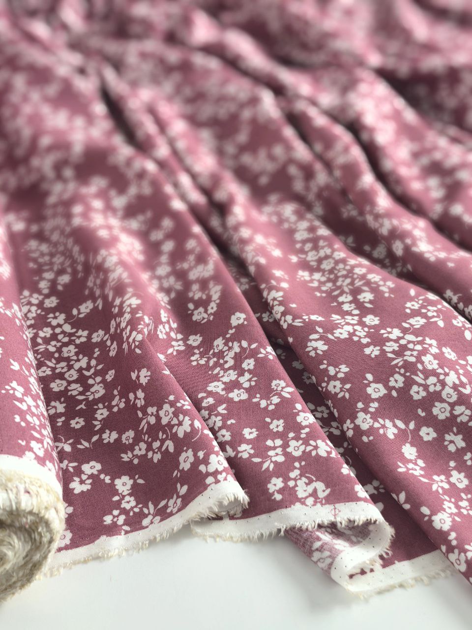 Нежная 100% вискозная ткань (штапель) с мелким цветочным рисунком в благородном розово-ягодном оттенке. Ткань мягкая, пластичная, приятно струится и красиво драпируется, создавая лёгкие, женственные силуэты.