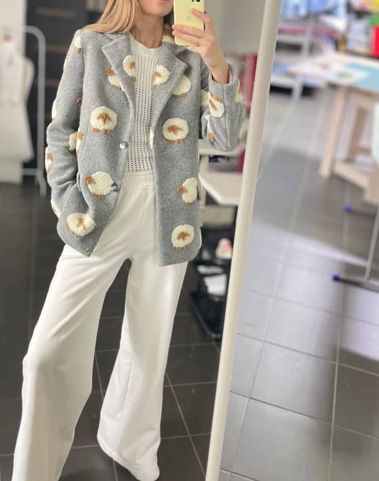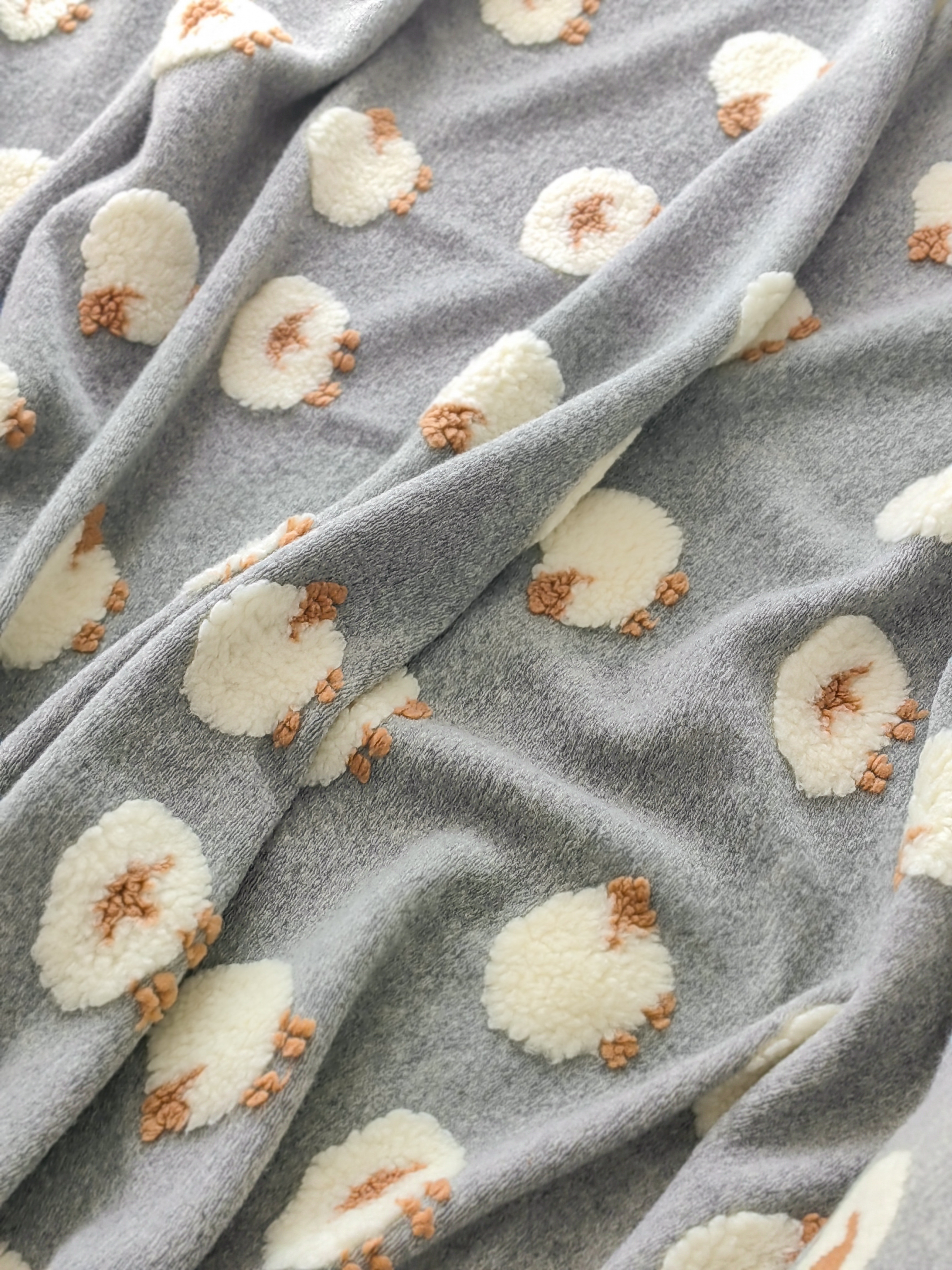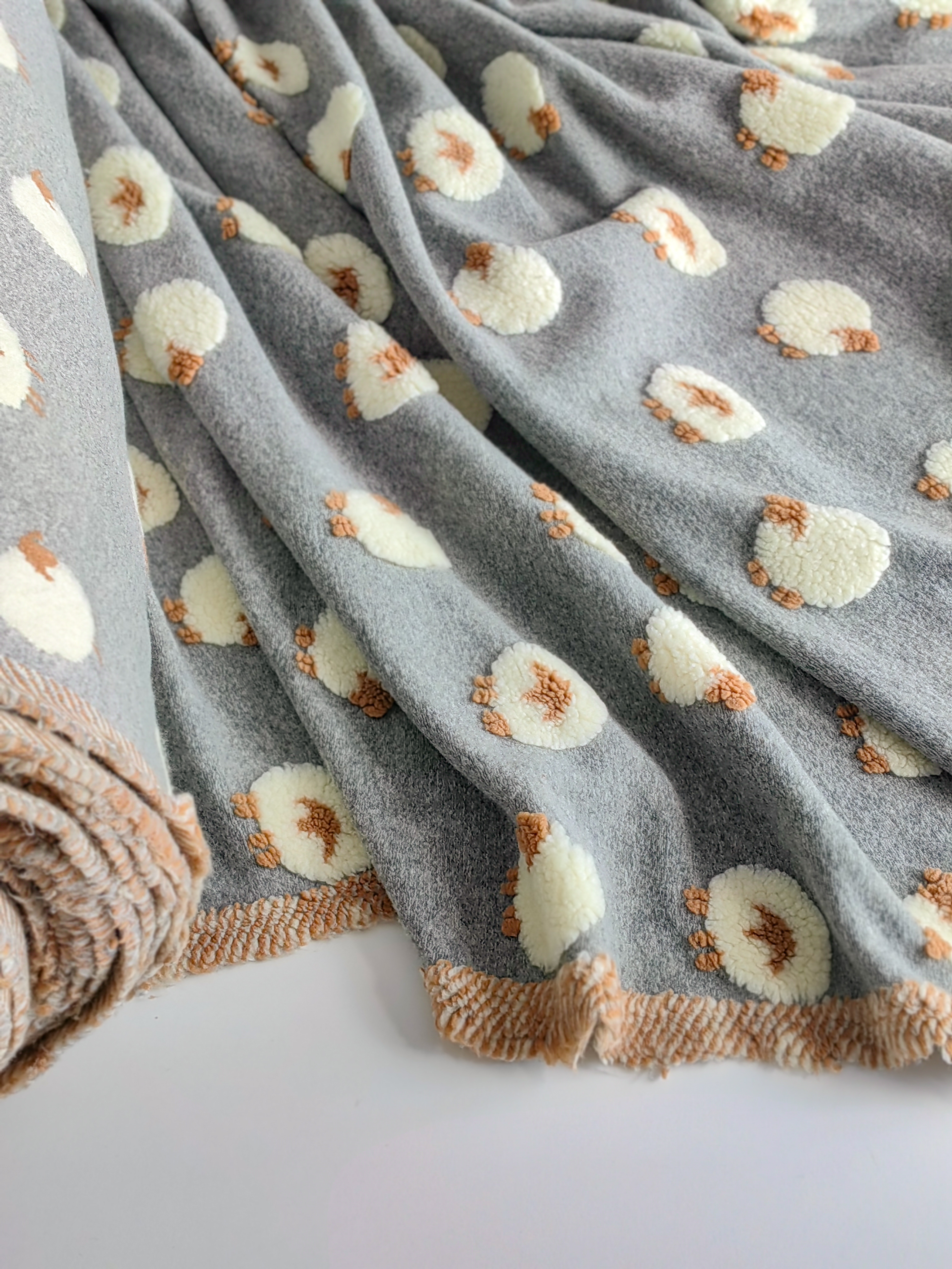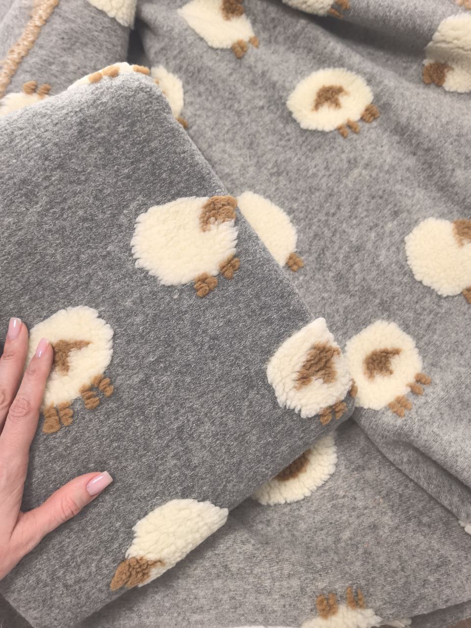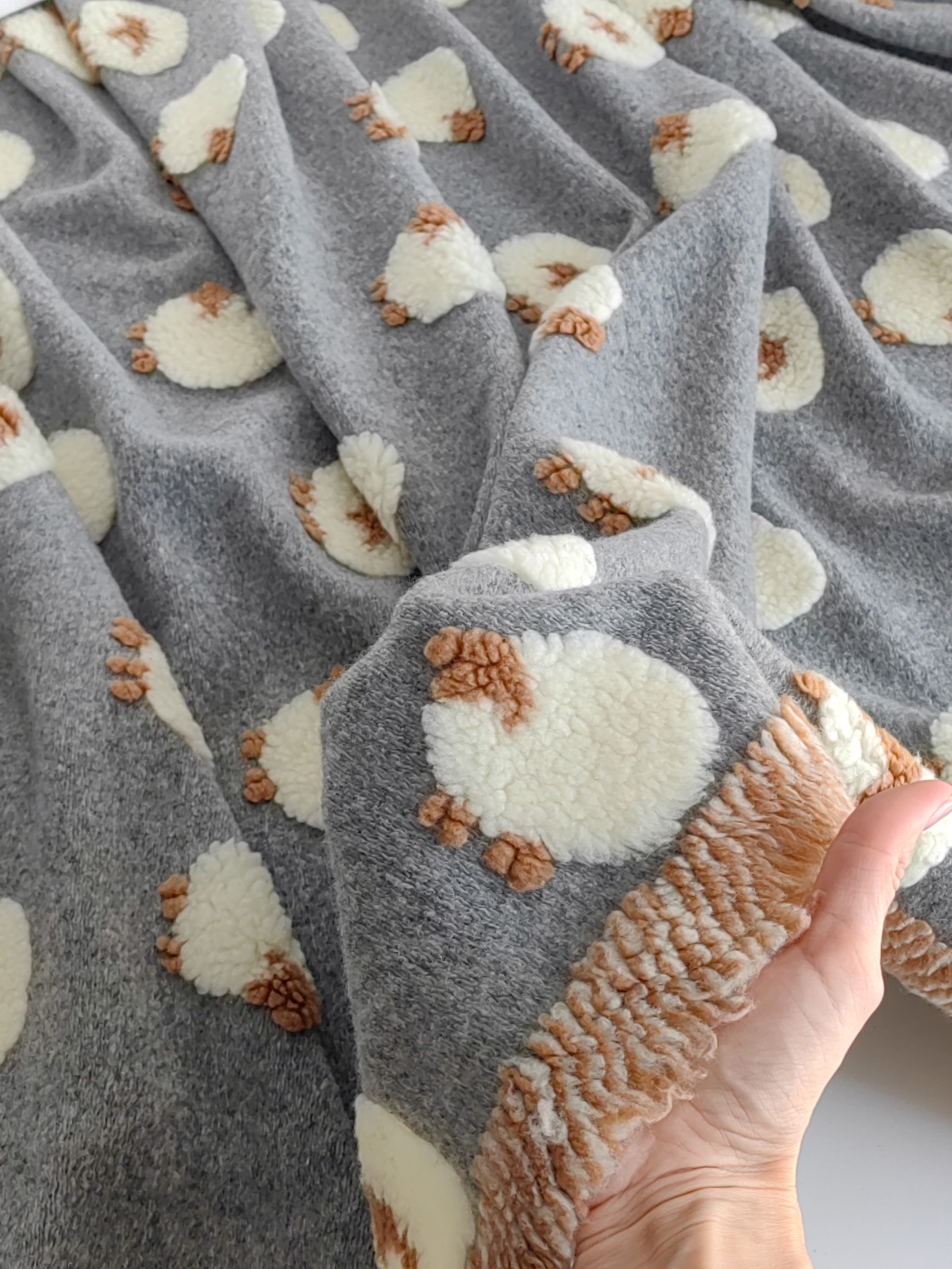Мягкий трикотаж с вышитыми объемными барашками для необычных кардиганов, свитшотов, пледов, домашних костюмов. Аккуратная вязка, мягкий, приятный на ощупь, сохраняет форму при растяжении. Тянется не сильно.