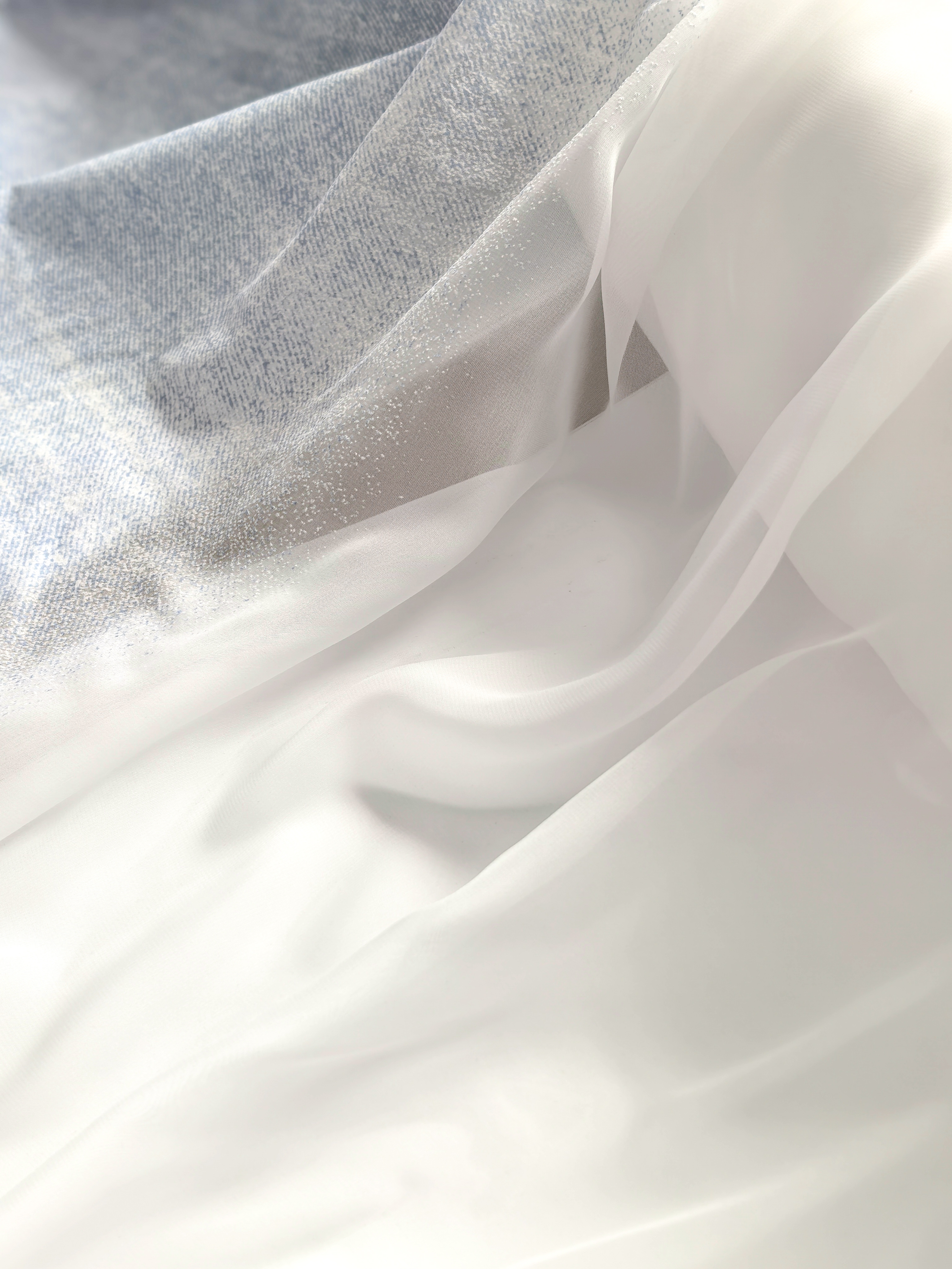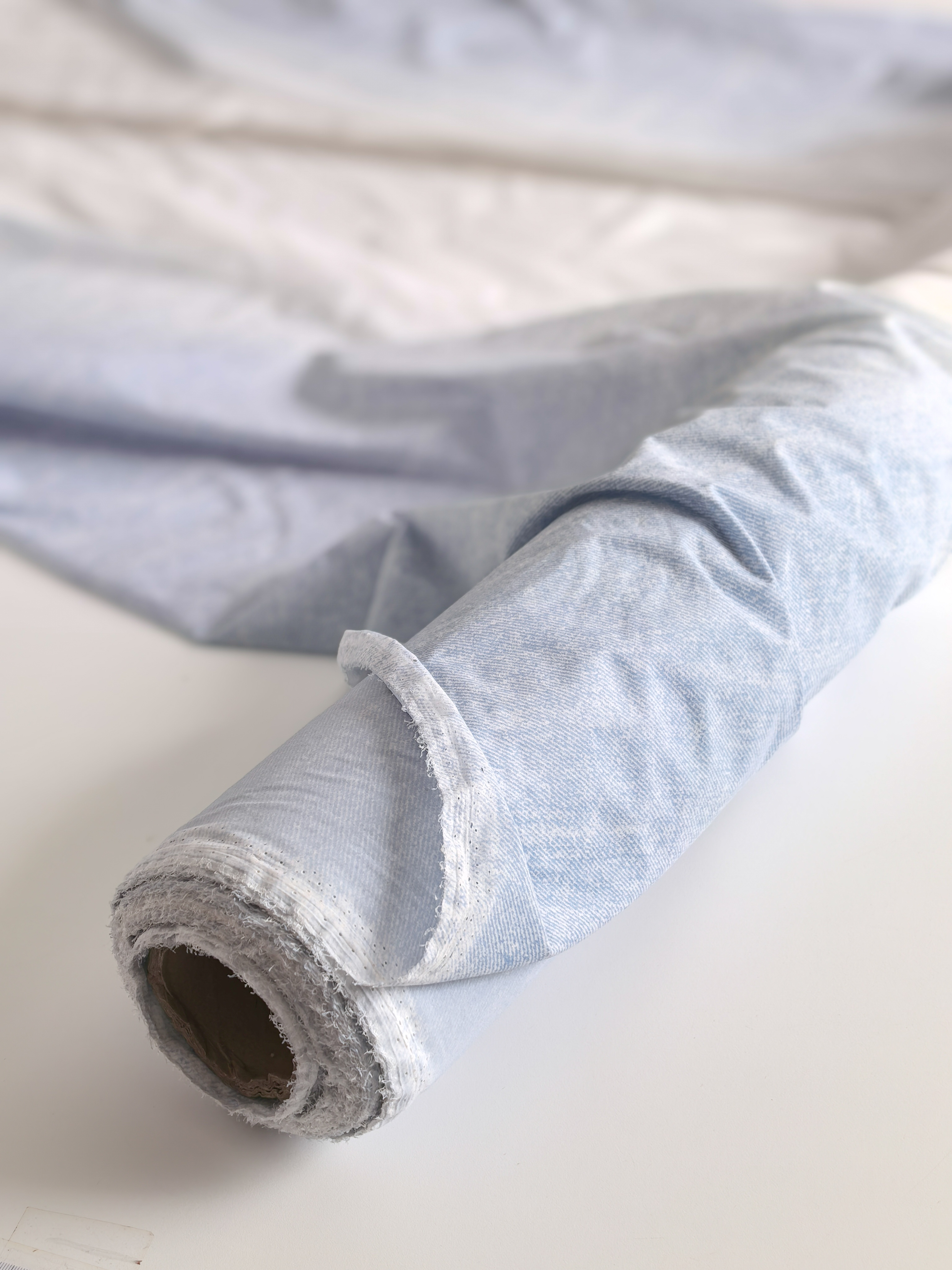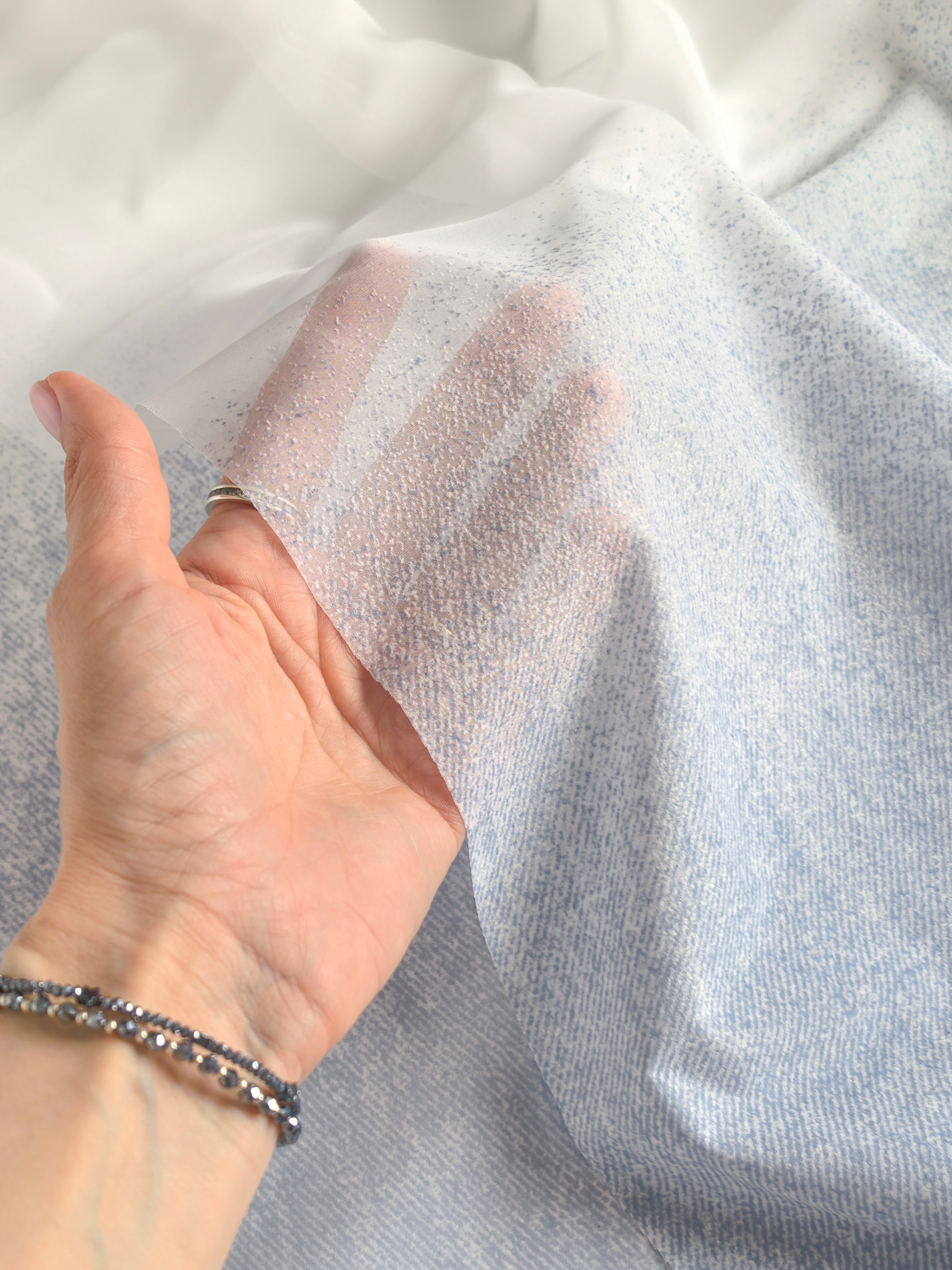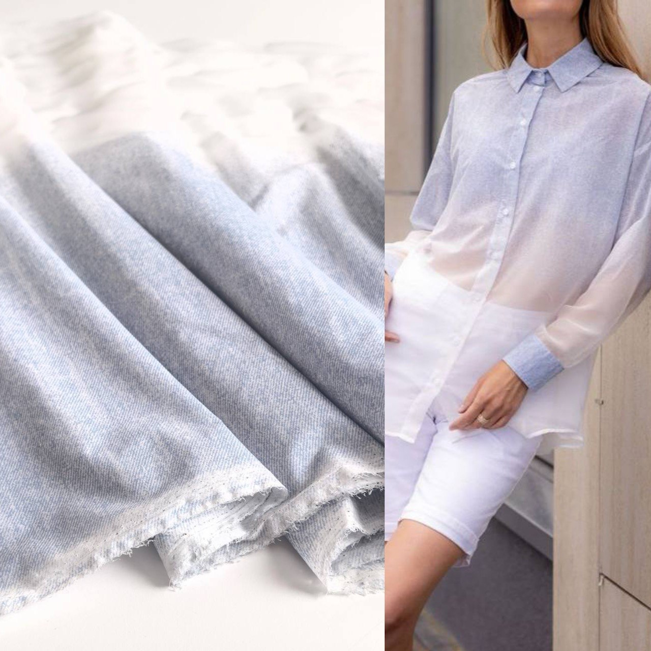 Деним переходящий в легкий шифон. Середина шифоновая. Кроить можно поперек. Готовая рубашка на 2 фото. Деним вдоль кромок +-45 см, плавно переходит в шифон
