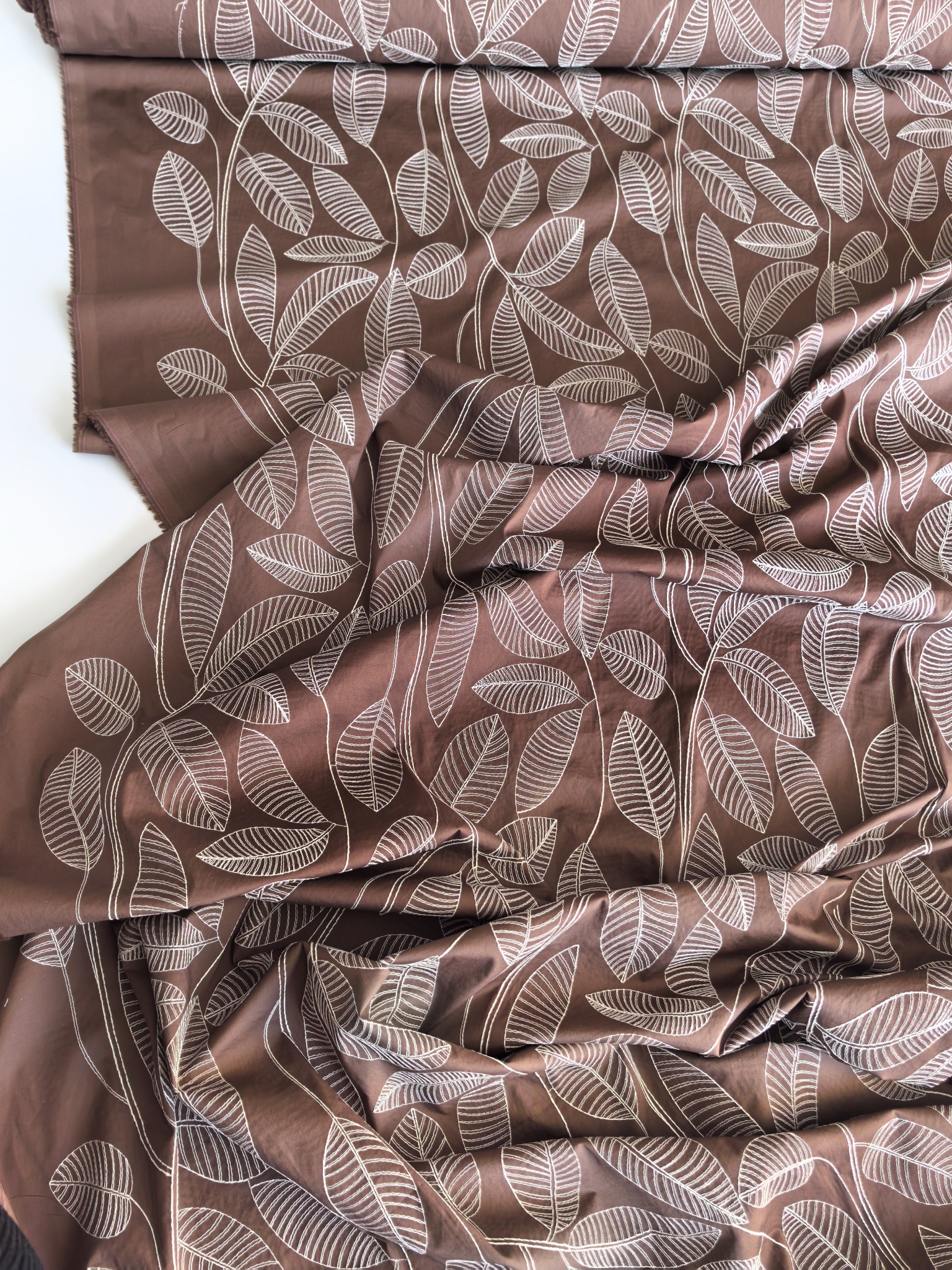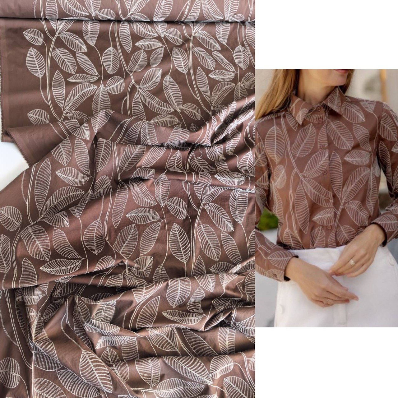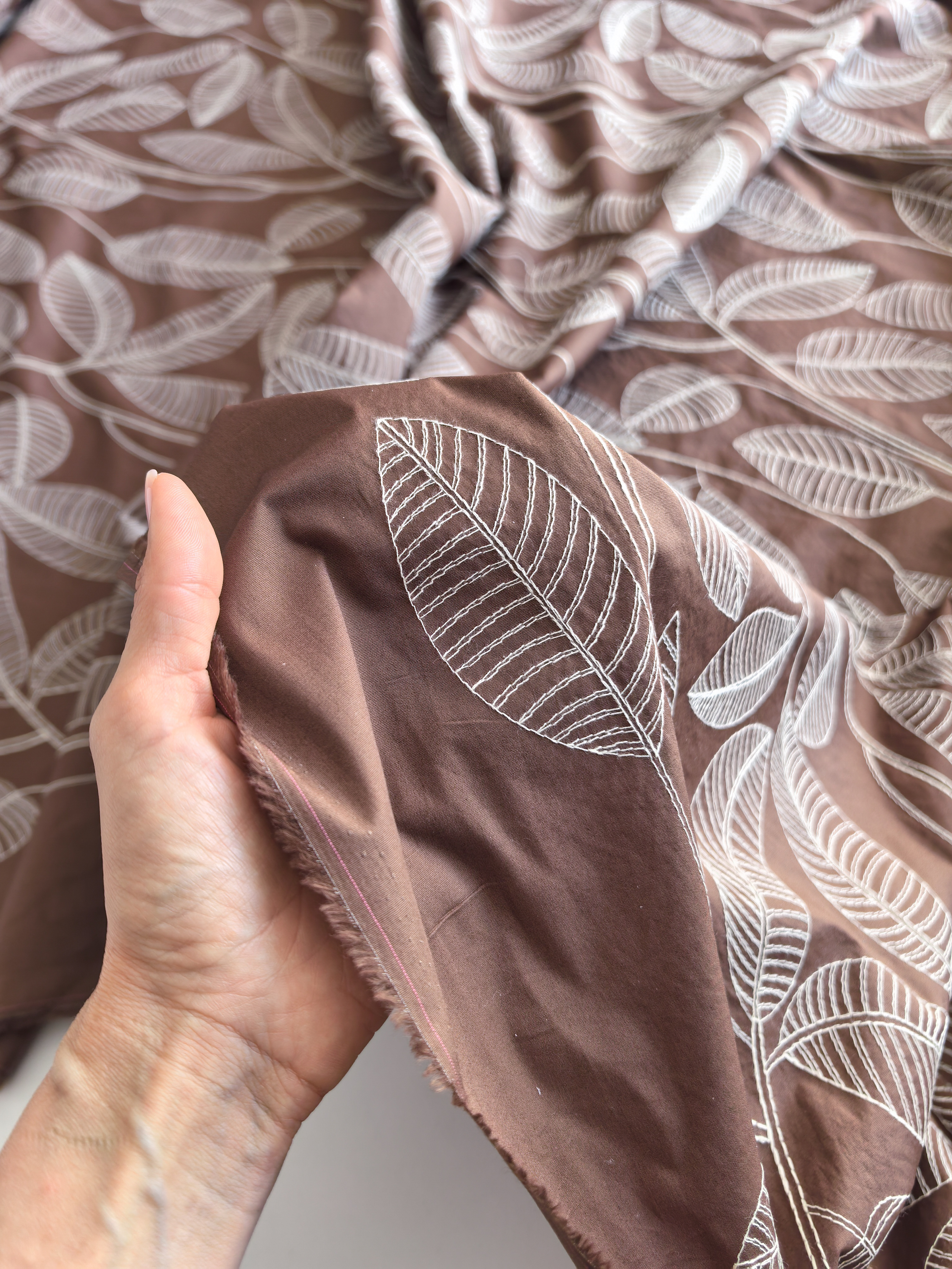 Натуральный 100% хлопок с вышивкой – стильная ткань высокого качества, созданная для тех, кто ценит комфорт, красоту и экологичность. ✔ Дизайн: утонченный растительный орнамент с вышивкой в виде листьев придает ткани изысканный и современный вид. ✔ Цвет: благородный коричневый с контрастной светлой вышивкой — универсальная основа для повседневных и нарядных изделий. ✔ Состав: 100% хлопок — дышащий, гипоаллергенный, приятный к телу. ✔ Фактура: мягкая, плотная, хорошо держит форму, при этом комфортна в носке.  Применение: платья, блузки, юбки, сарафаны рубашки и топы одежда для детей и взрослых аксессуары (сумки, платки, косынки) текстиль для дома и декор  Преимущества: экологичный натуральный материал трендовый растительный дизайн подходит как для повседневной, так и праздничной одежды продается метражом — можно заказать ровно столько, сколько нужно Ширина полотна 148 см Ширина вышивки 135 см