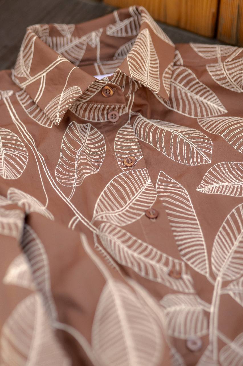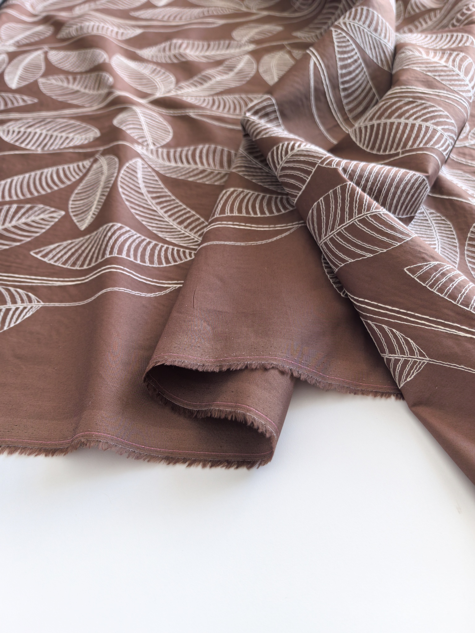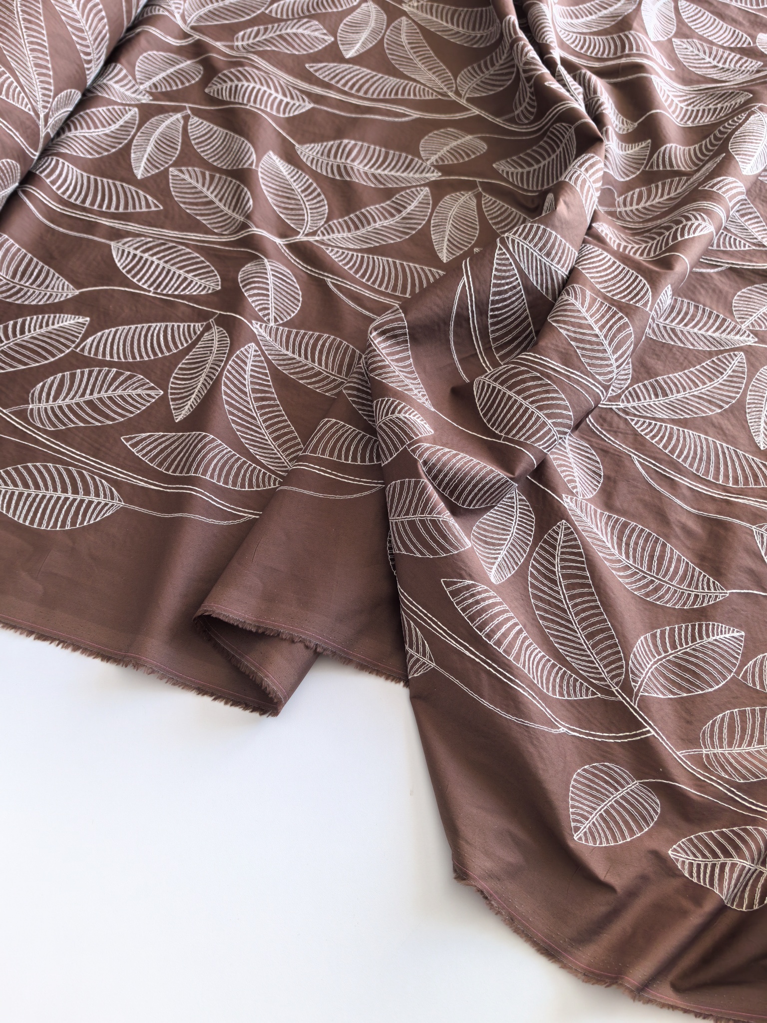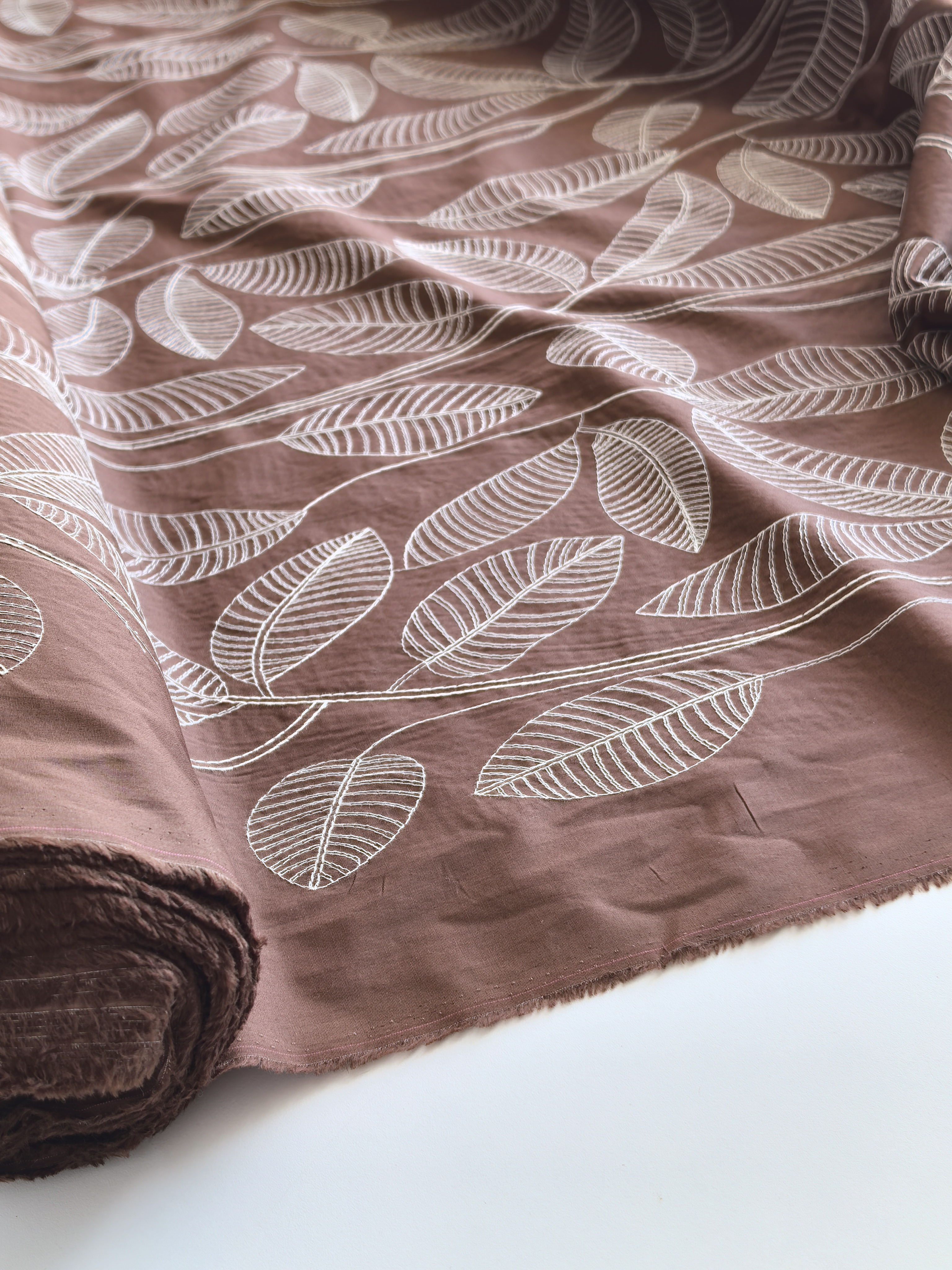 Натуральный 100% хлопок с вышивкой – стильная ткань высокого качества, созданная для тех, кто ценит комфорт, красоту и экологичность. ✔ Дизайн: утонченный растительный орнамент с вышивкой в виде листьев придает ткани изысканный и современный вид. ✔ Цвет: благородный коричневый с контрастной светлой вышивкой — универсальная основа для повседневных и нарядных изделий. ✔ Состав: 100% хлопок — дышащий, гипоаллергенный, приятный к телу. ✔ Фактура: мягкая, плотная, хорошо держит форму, при этом комфортна в носке.  Применение: платья, блузки, юбки, сарафаны рубашки и топы одежда для детей и взрослых аксессуары (сумки, платки, косынки) текстиль для дома и декор  Преимущества: экологичный натуральный материал трендовый растительный дизайн подходит как для повседневной, так и праздничной одежды продается метражом — можно заказать ровно столько, сколько нужно Ширина полотна 148 см Ширина вышивки 135 см