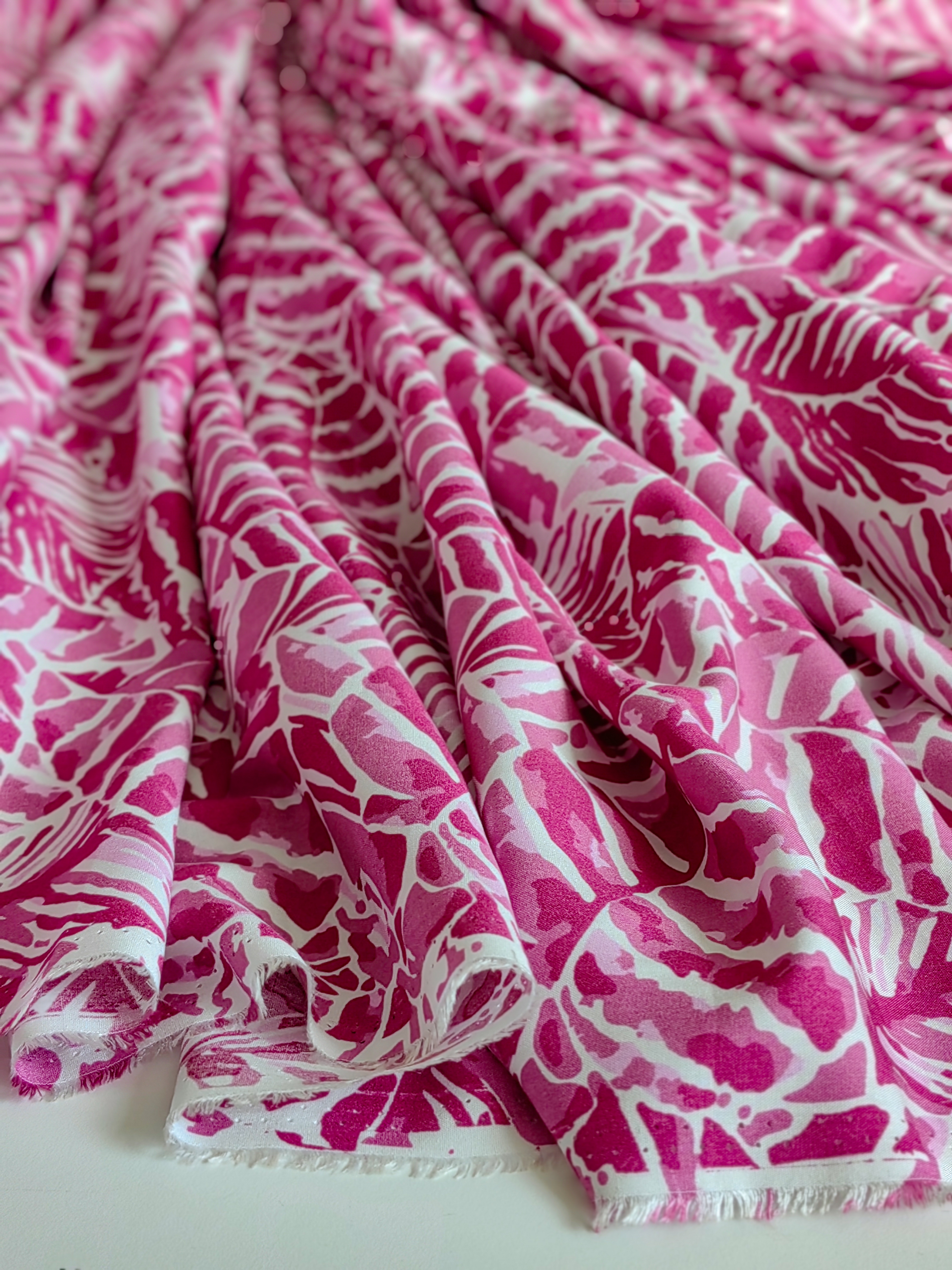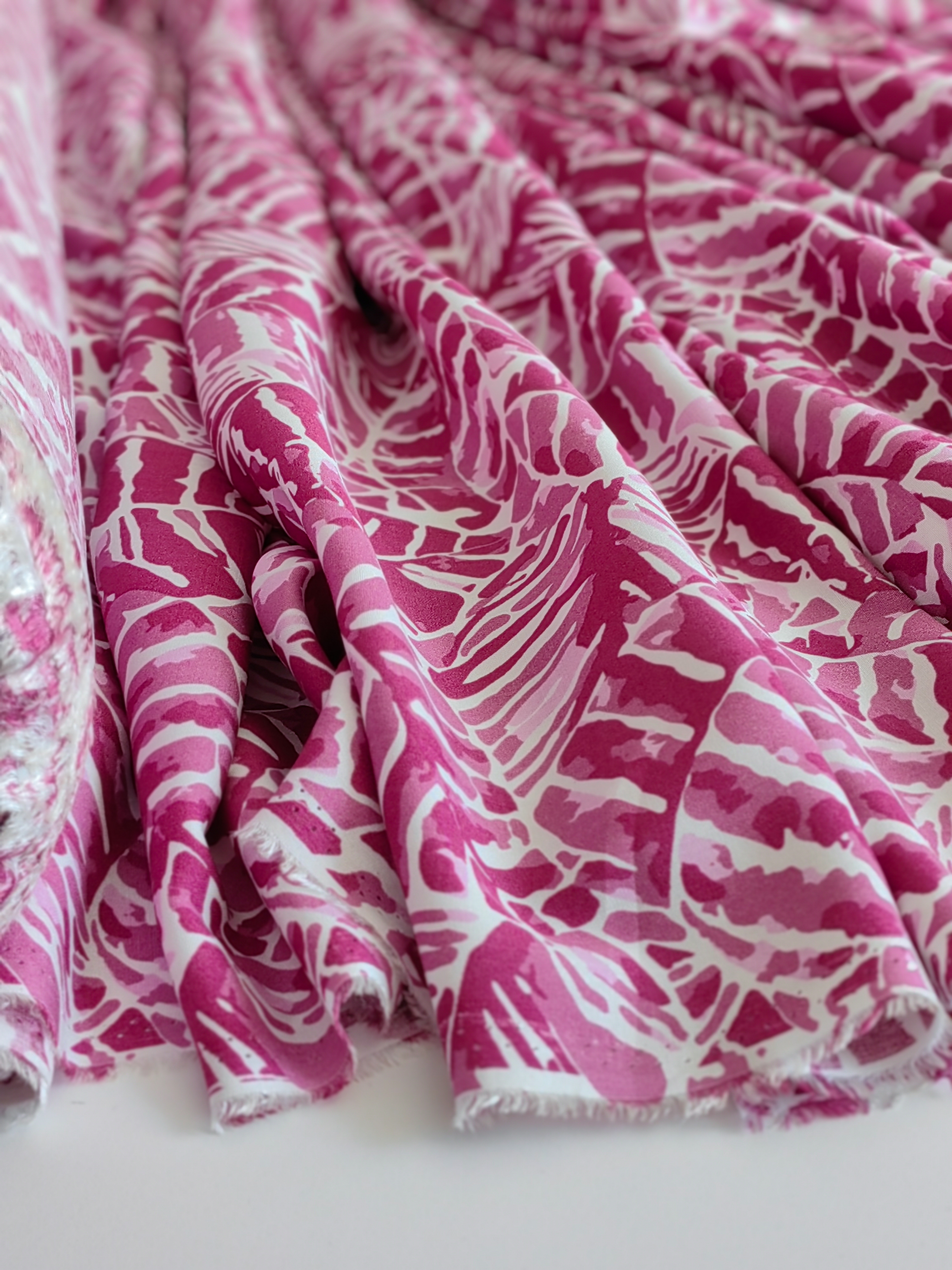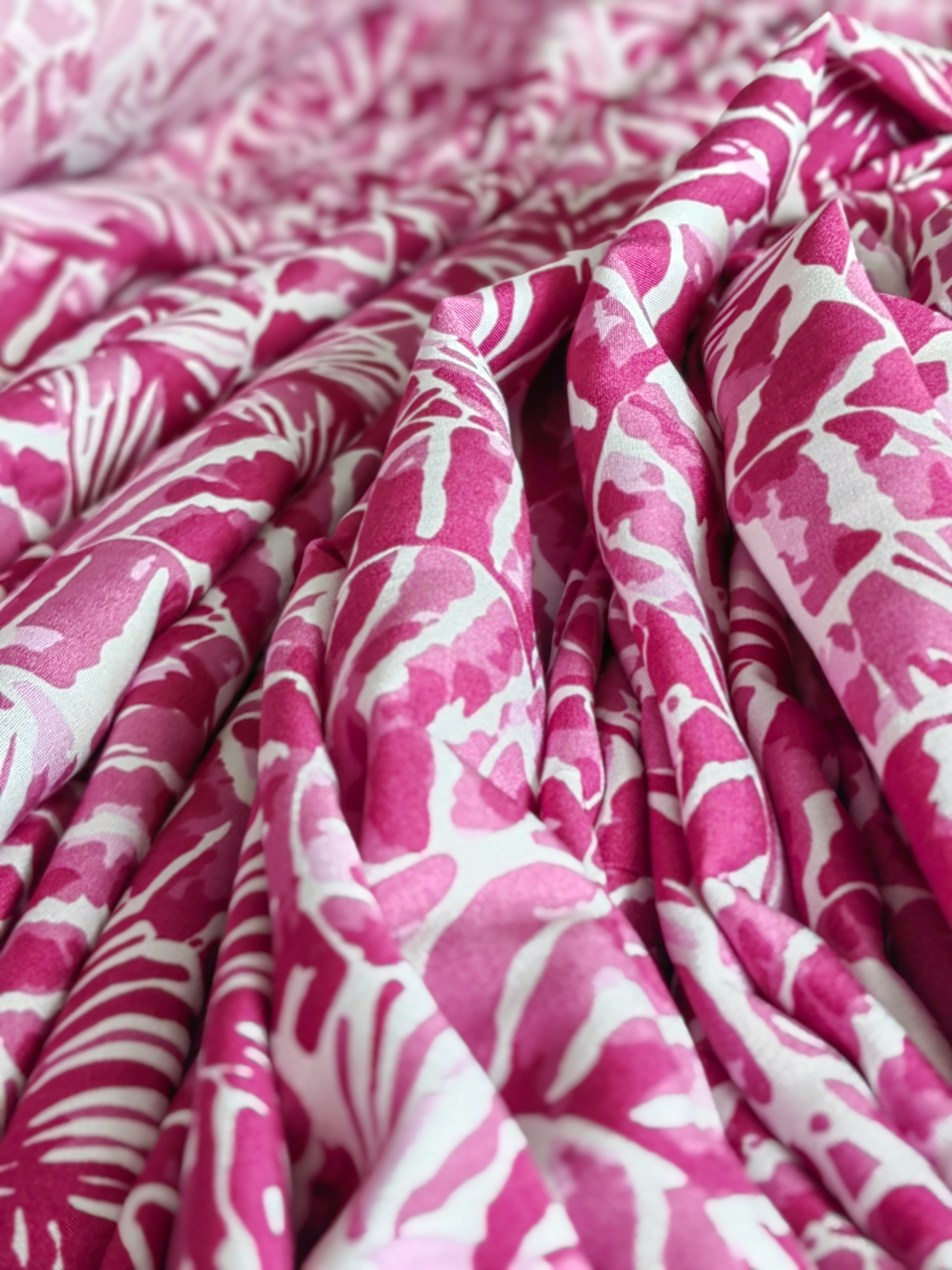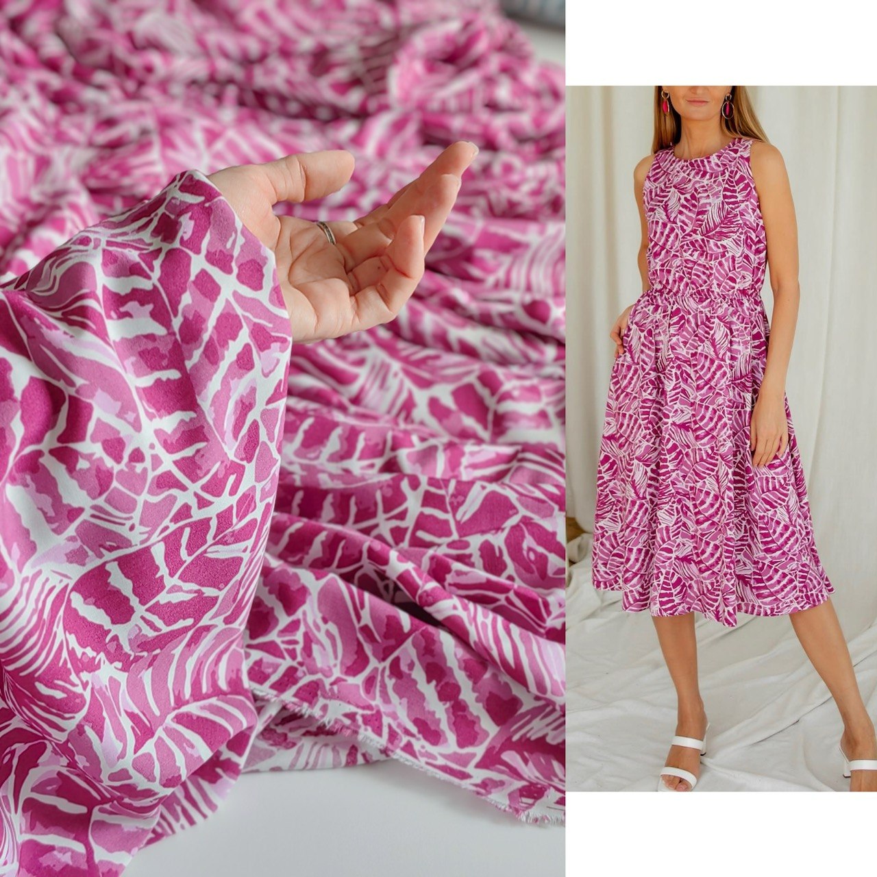 Летящая, струящаяся ткань, нежная и приятная на ощупь. Приятный приглушенный розовый цвет. Не просвечивает, не тянется, не электризуется. Воздушная и красиво драпируется. Идеальна для пошива платьев, блуз, юбочек, рубашек, широких брюк на резинке.