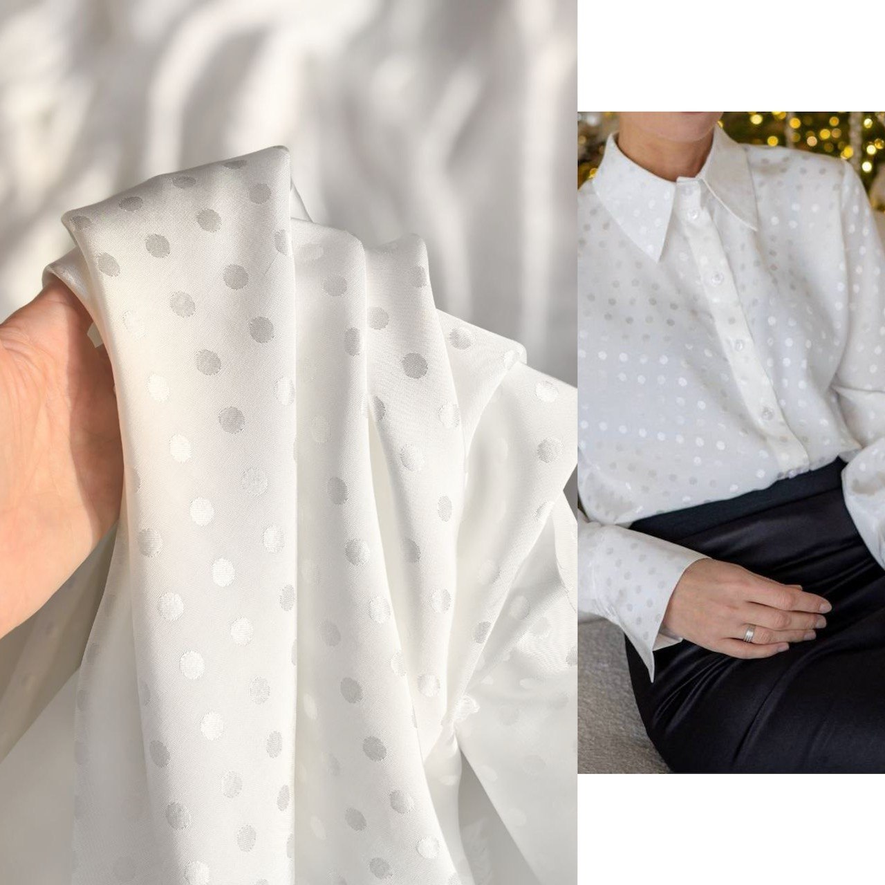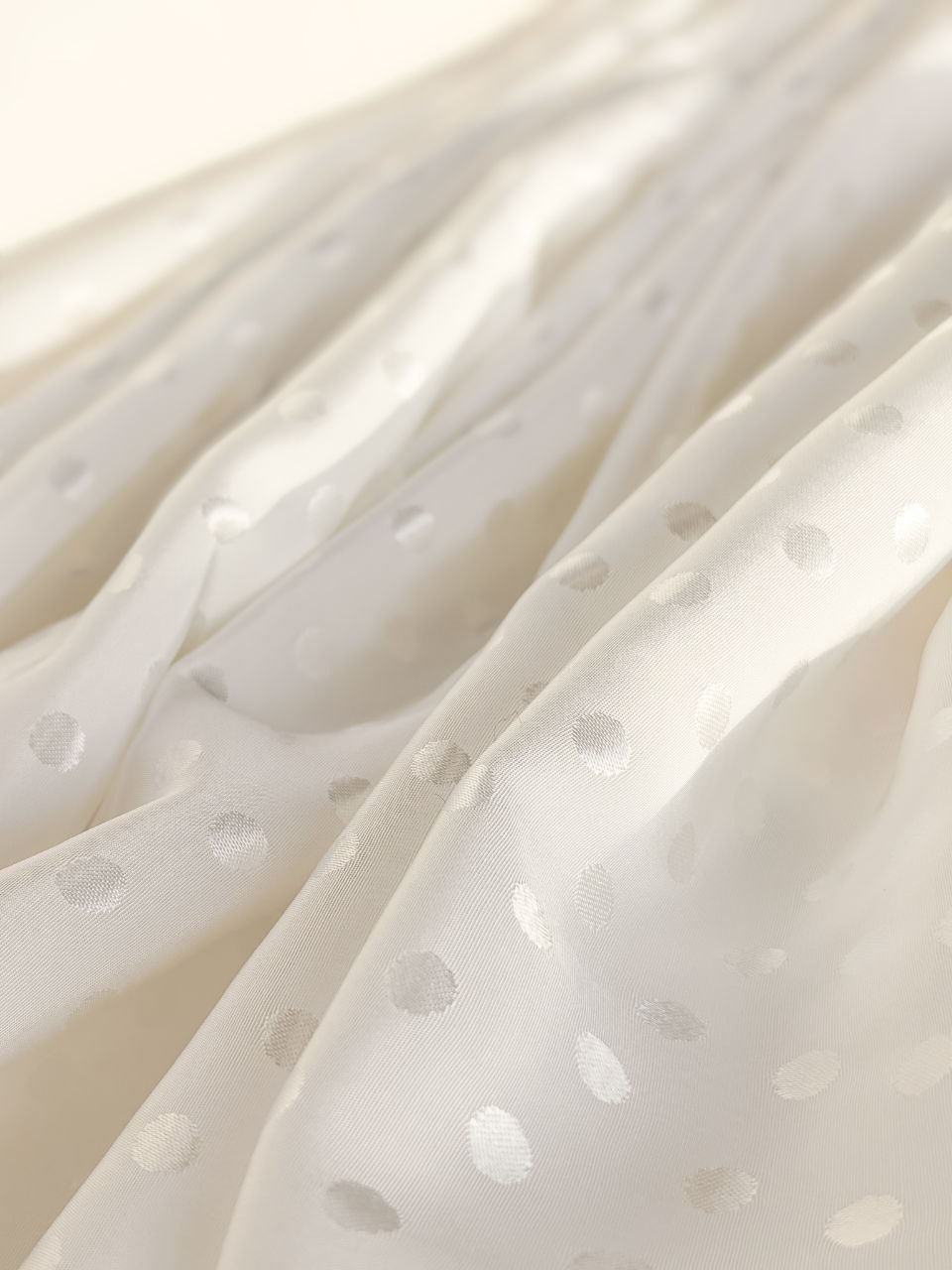 Материал имеет деликатный жаккардовый рисунок в виде мелкого горошка диаметром 8 мм, который мягко блестит при свете и делает ткань по-настоящему нарядной.