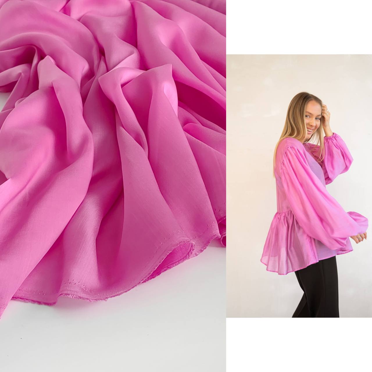 Невероятно приятная к телу нежная органза из тенсела с добавлением нейлоновых нитей. Благодаря нейлону ткань упругая, держит форму.