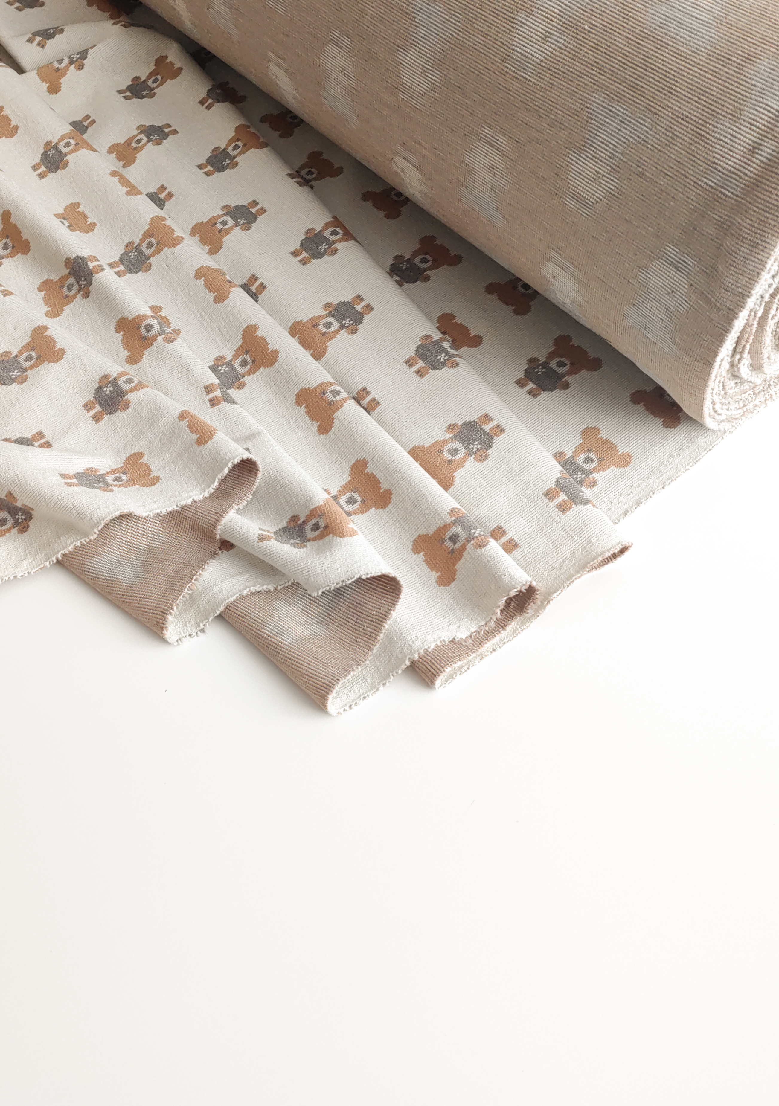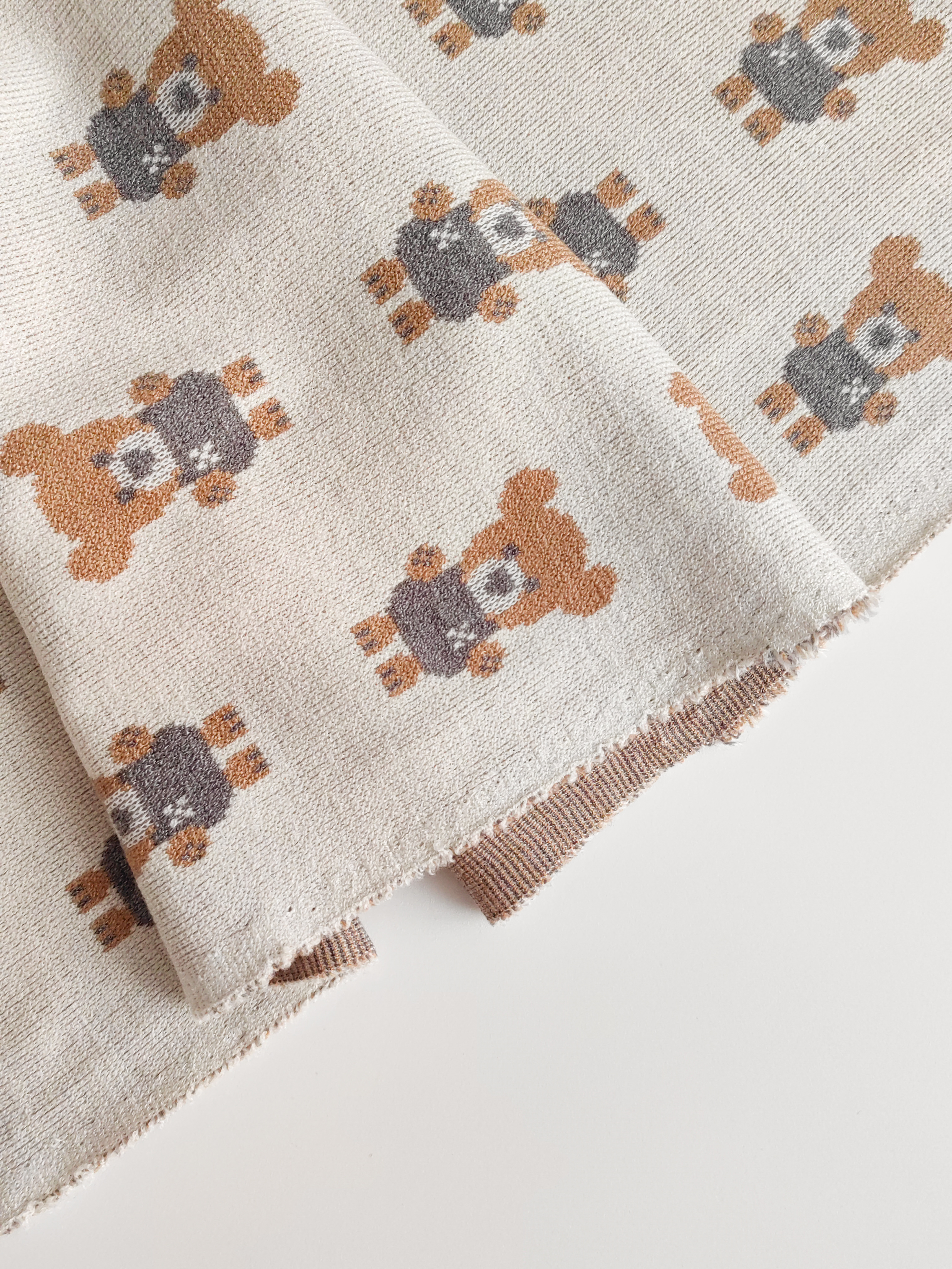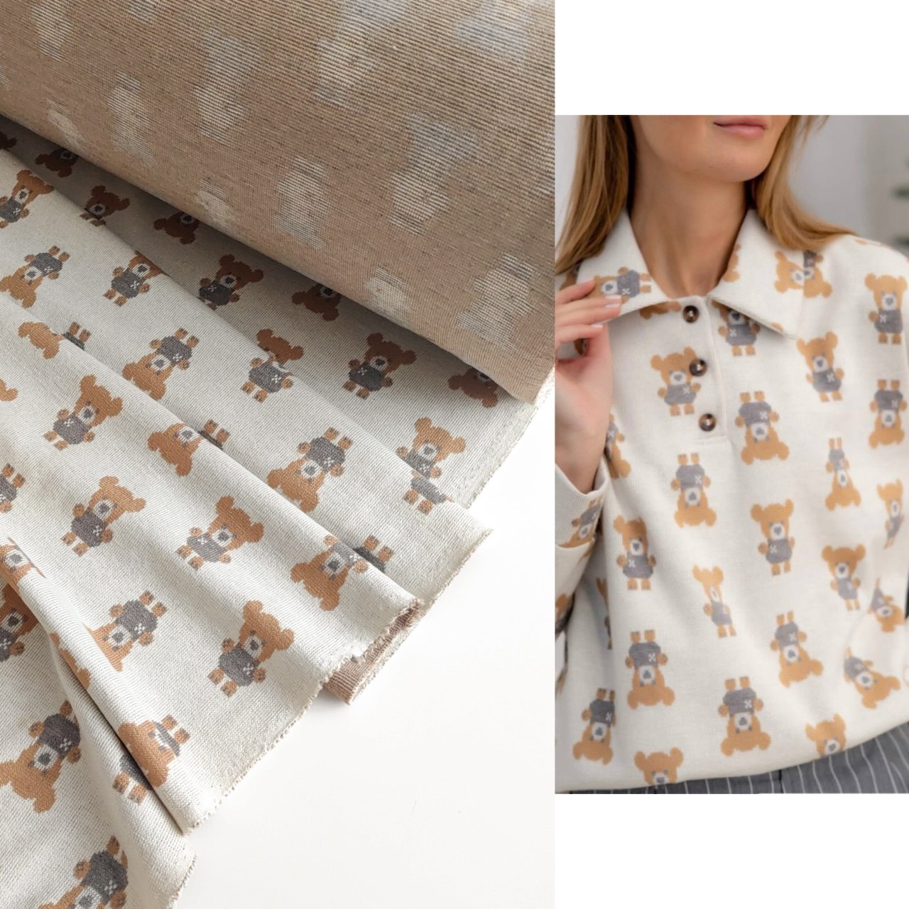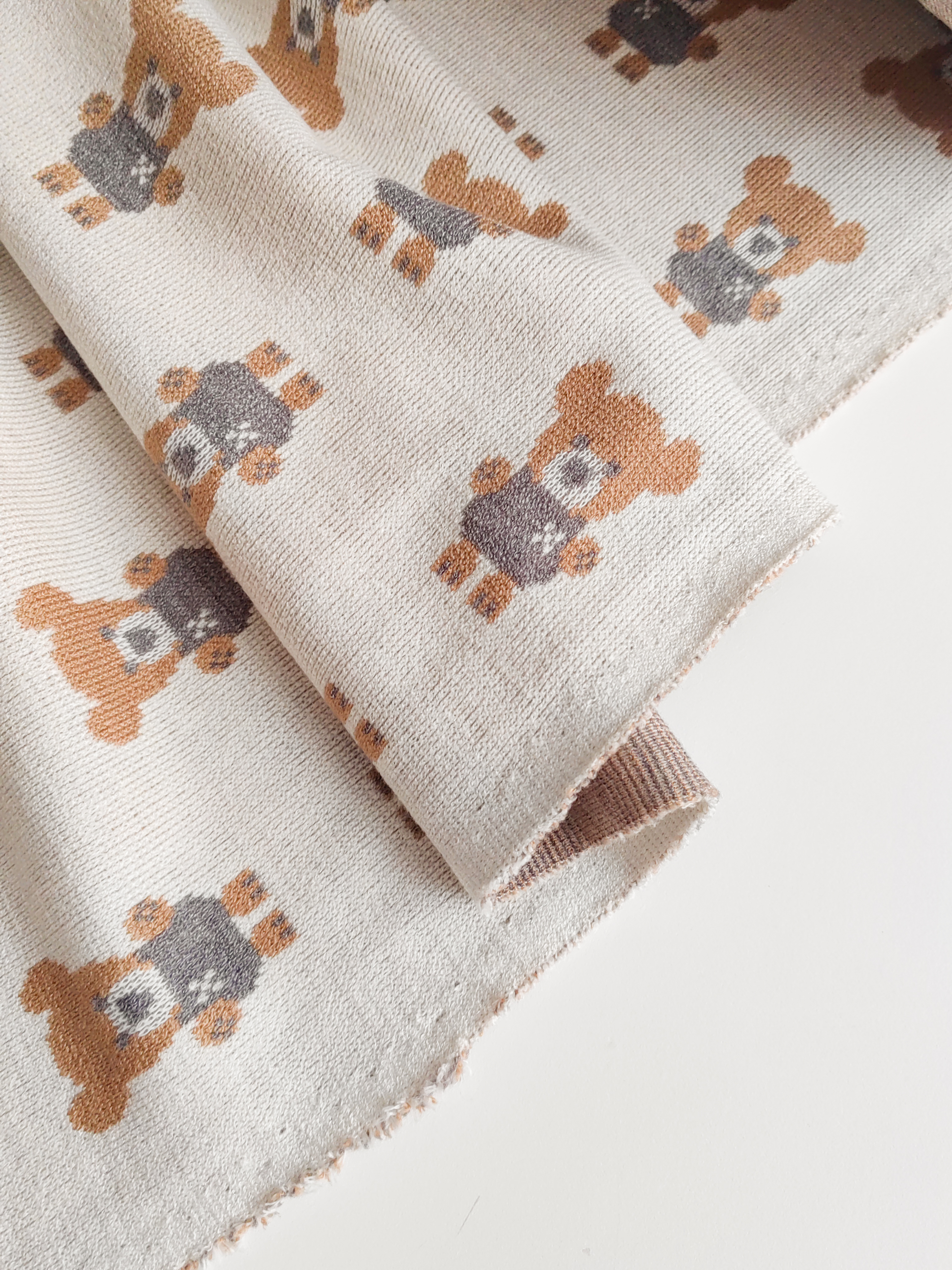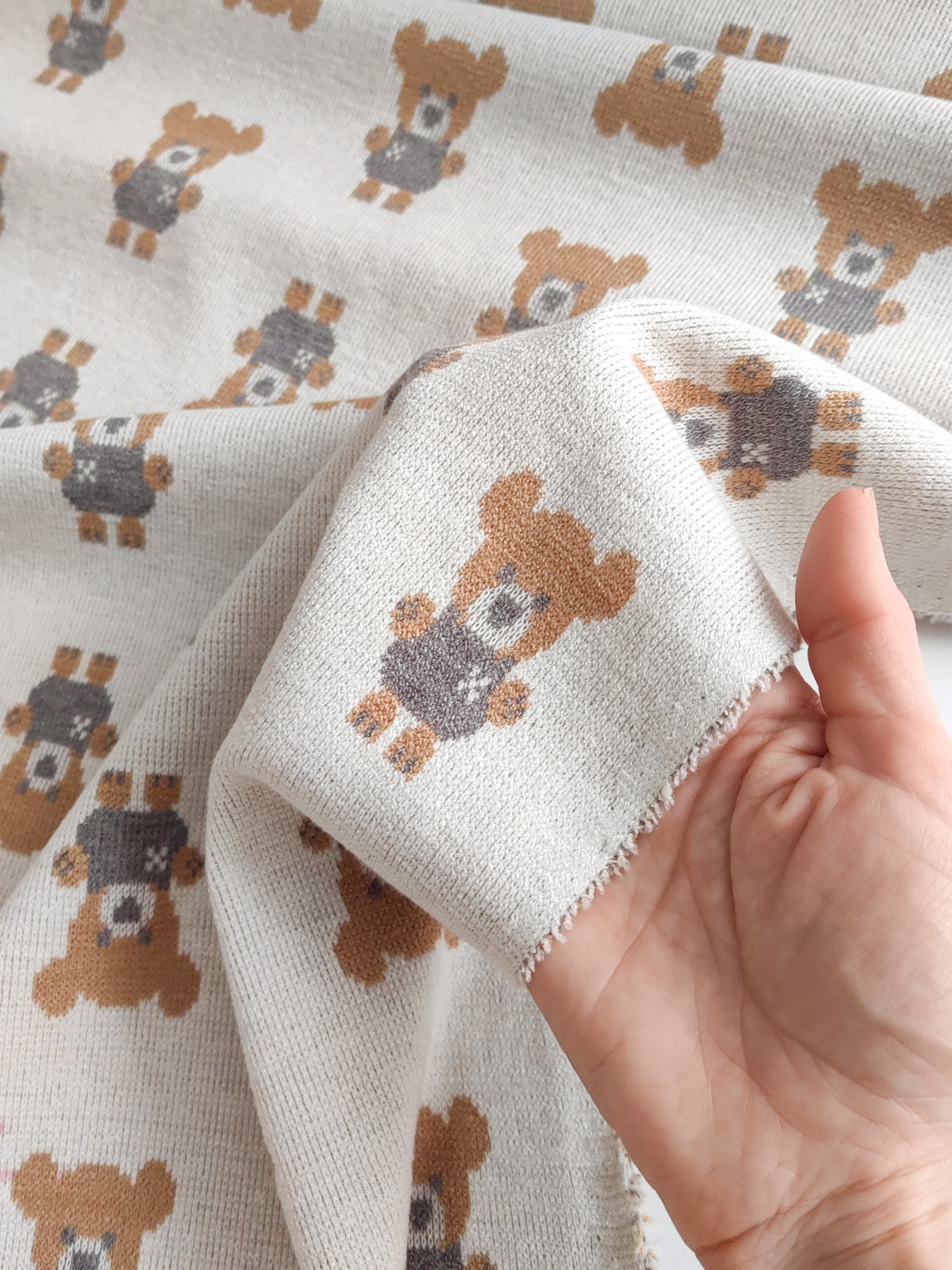 Мягкий трикотажный Жаккард.  Аккуратная вязка, приятный на ощупь, сохраняет форму при растяжении. Тянется не сильно. Подойдет на свитшоты, кардиганы, бомберы, брюки на резинке, пледы, подушки. Состав: 40% вискоза 40% пэ 20% нейлон Ширина полотна 158 см  Плотность 330 г/м2 Размер Мишки 6х4 см Обратите внимание. Цветопередача может отличаться от действительности. Это зависит от модели и экрана вашего устройства, а так же вашего цветовосприятия. Магазин Галереятканей.рф не несёт ответственности за несоответствие цвета реального товара и изображения на Вашем устройстве. Мы рады предоставить вам дополнительные фото и видео при необходимости.